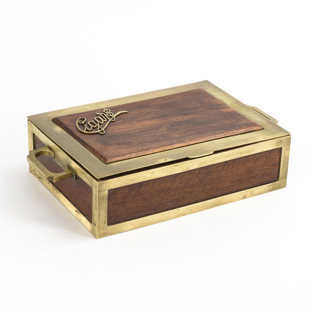 Cigar box made of wooden panels in brass frame "à cage" with fixed handles on the sides; on the hinged lid mounted writing "Cigars". Interior fanned. Minimal signs of age / use.