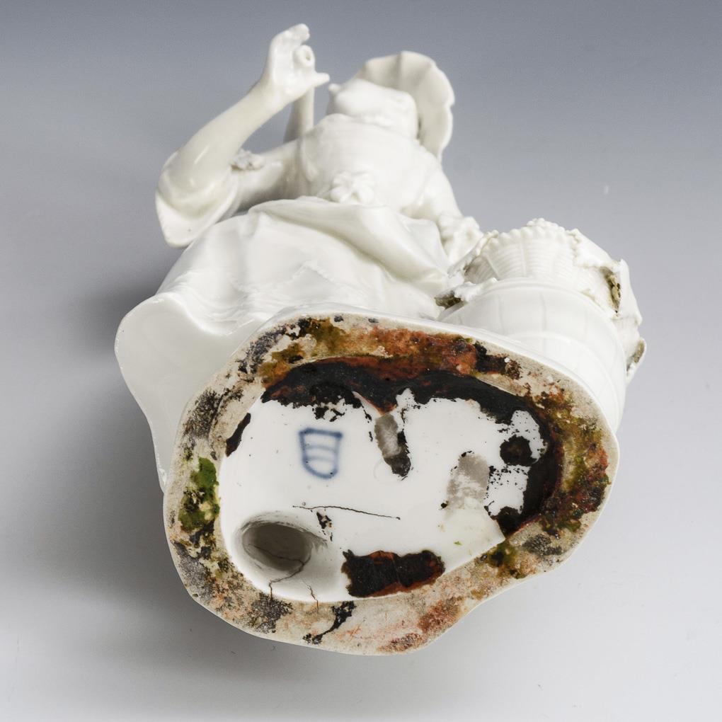 At a grape basket standing lady as a winemaker, in her left hand holding a winemaker's knife and in her right hand a club. Grapes, both hands restored with knife and club respectively.