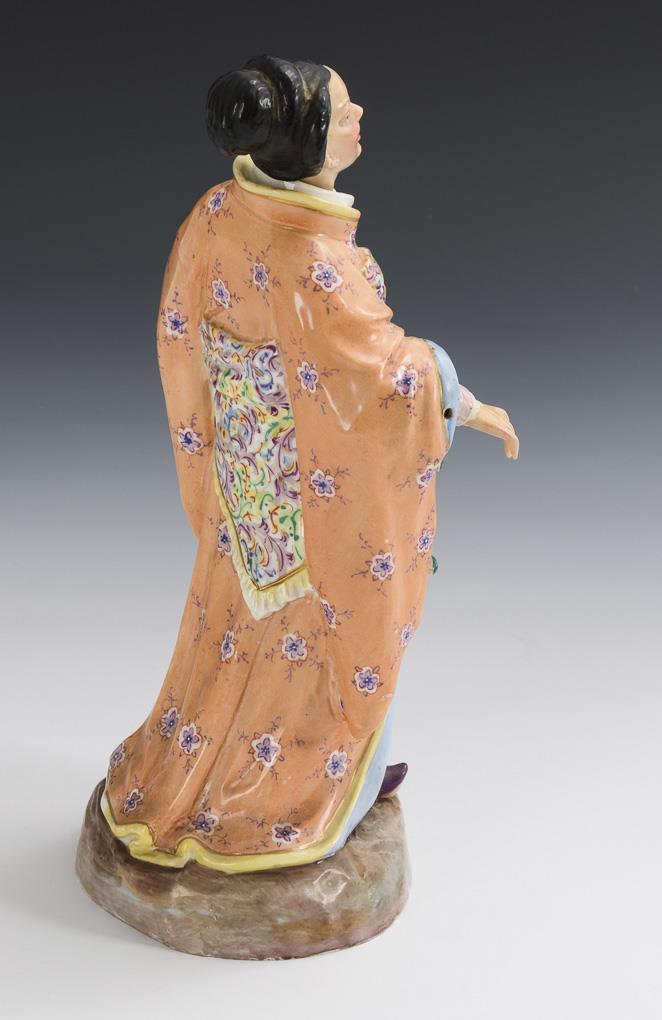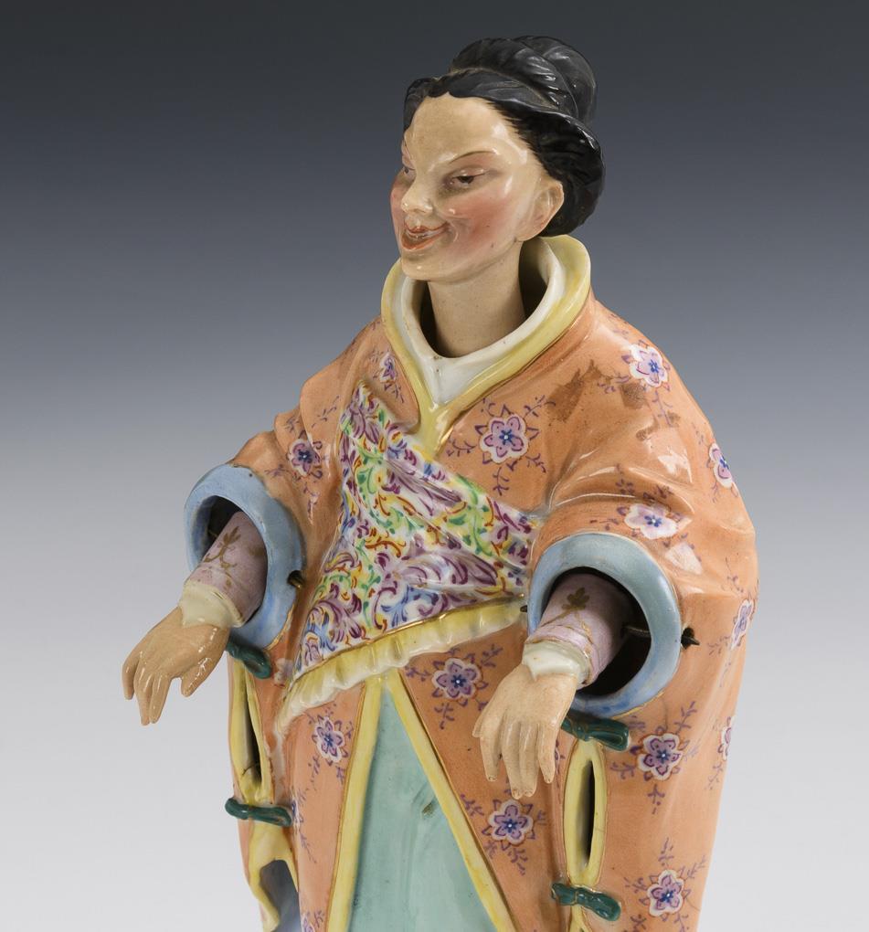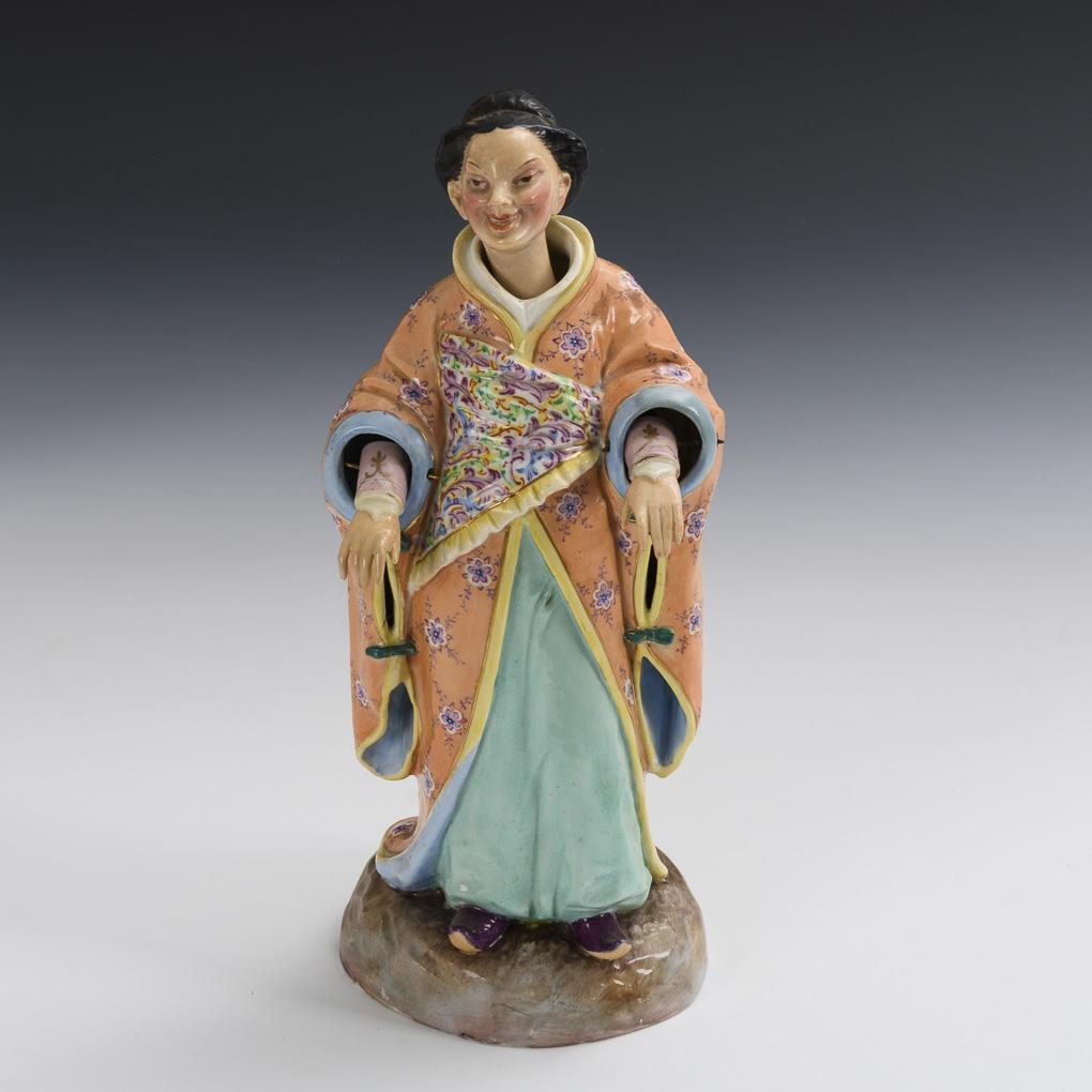 Standing Japanese woman in traditional dress with wiggling head and hands. Both hands restored, partial gold rubbing.