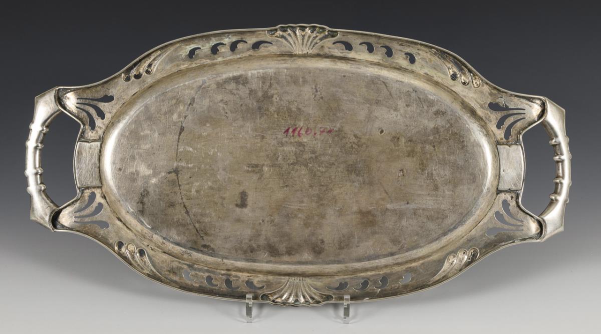 Oval tray with relief and breakthrough pattern. Signs of use.