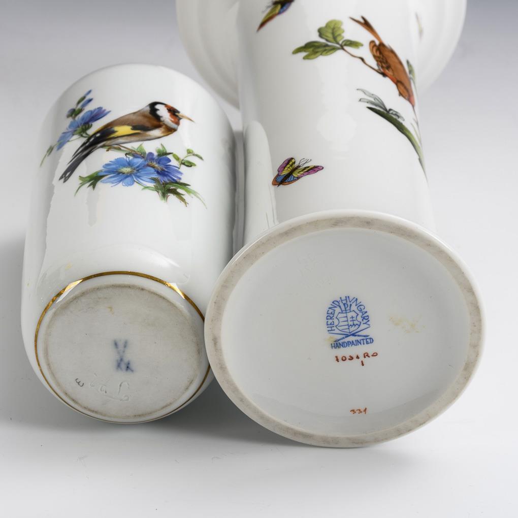 1x MEISSEN, sword mark, 2nd h. 20th c., 2 grinding strokes: Balustervasemit the on-show depiction of a goldfinch. / 1x HEREND, 2nd H. 20th Century: flute vase with Rothschilddekor.