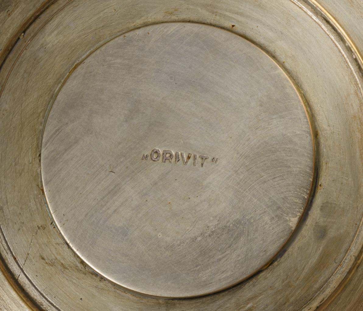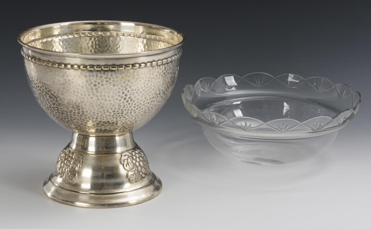 Brass with silver plating, colorless glass with notch cut on the scalloped rim. H 25 cm, Ø 27 cm.