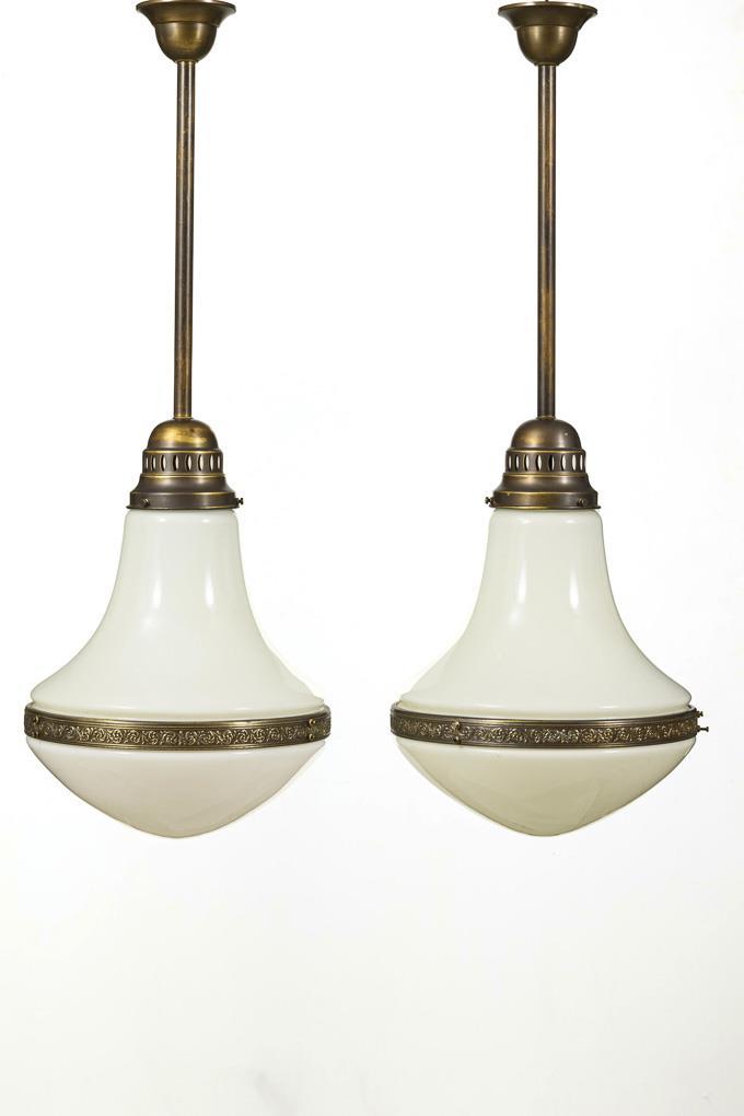 Pair of 1-flame ceiling lamps on central shaft with bell-shaped canopy and bell-shaped holder with 2-part, drop-shaped glass shade, framed by brass band with meander decoration, in reference to the design classic "Luzette" by Peter Behrens for Siemens. Metal with slight traces of corrosion, 1 lamp with chips on the glass edges.