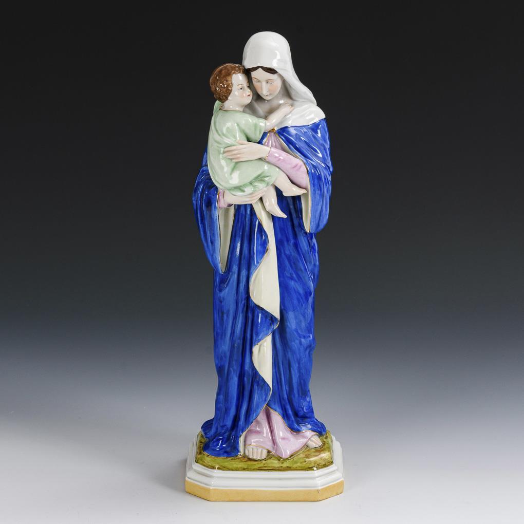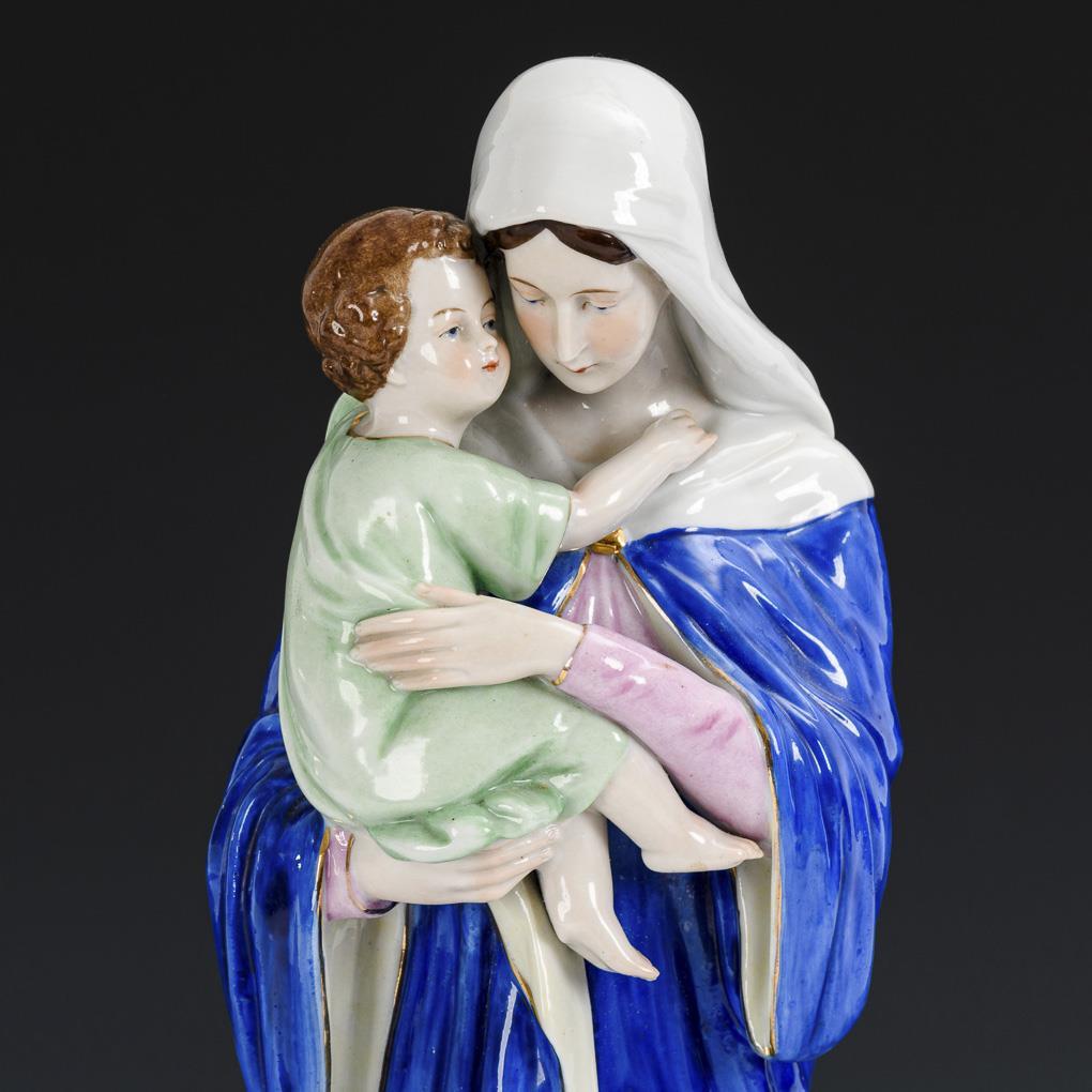 Mary standing on a rectangular base, holding the boy Jesus in her arms.