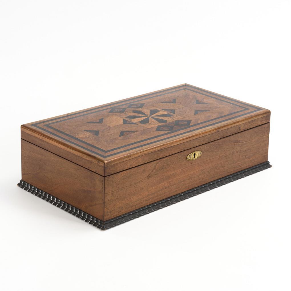 Walnut veneered or walnut and ebony(?) marquetry, ebonized flame moldings, brass fittings. 13 x 46 x 26 cm.