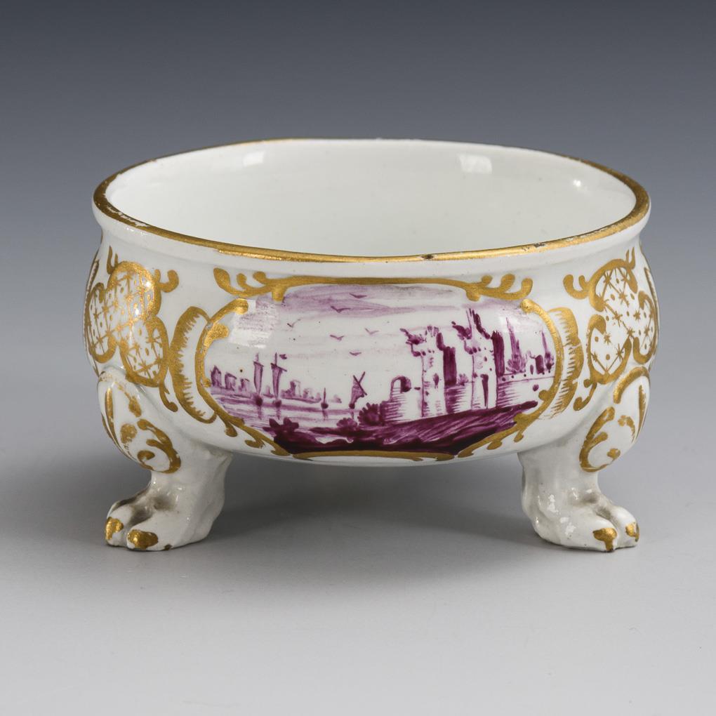 Small bowl with 3 paw feet, 3 vedute in gold cartouches. Minimal signs of age/use.