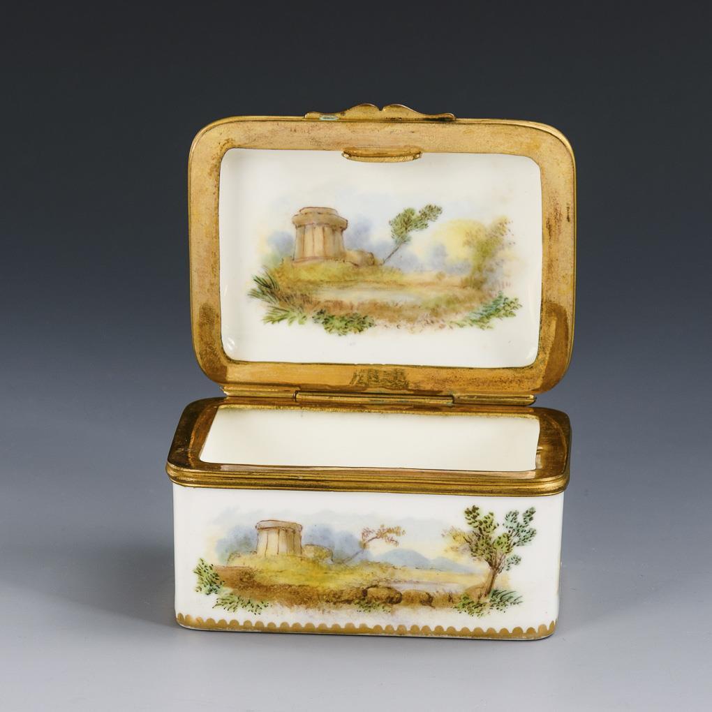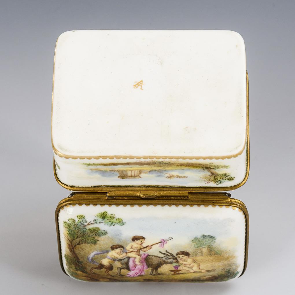 Rectangular box with metal mounted hinged lid. On all sides the depiction of small ideal landscapes, on the lid three bacchante children with rams.