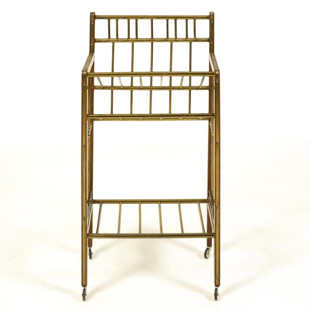Rolling newspaper rack with braced frame and 3 shelves made of brass rods. Slight signs of age/use, metal with signs of corrosion.