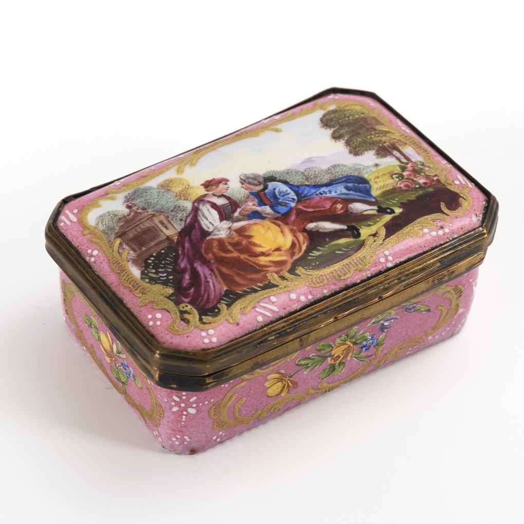 Quader box with slightly domed hinged lid. On the lid large cartouche with painted lovers in the park. On all sides flower branches in cartouches of enamel de Saxe, on the bottom a flower. Inside white. Minimal hairline cracks inside.