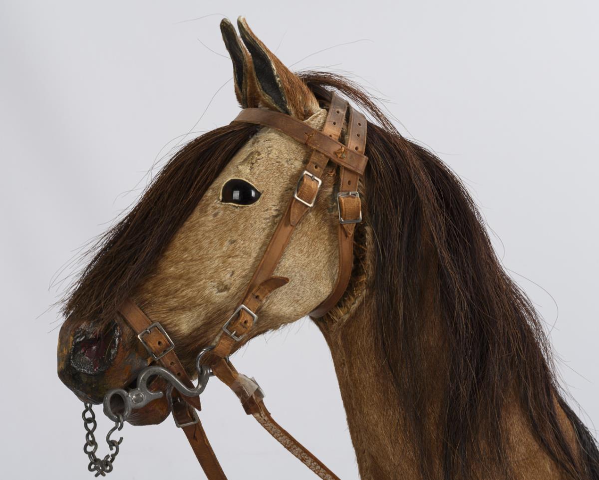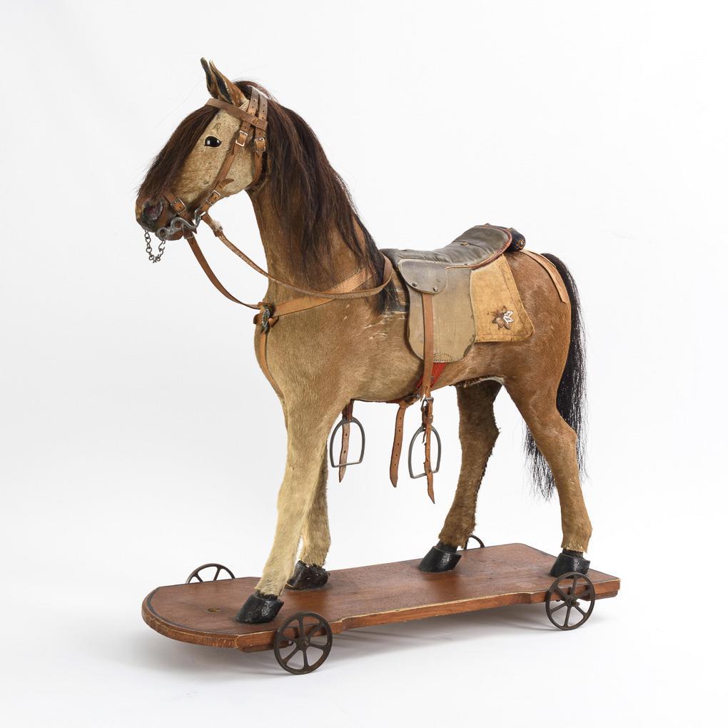Riding horse with real fur, glass eyes, bridle, saddle, brown mane and tail. On brown painted board with iron wheels. Traces of age, small defects.