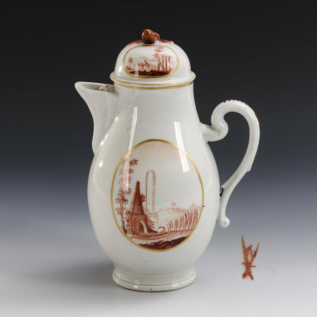 Pear jug with fruit knob lid. On both sides a gold-framed medallion with landscape painting with fountain, architecture and staffage. Lid fruit and leaves restored.