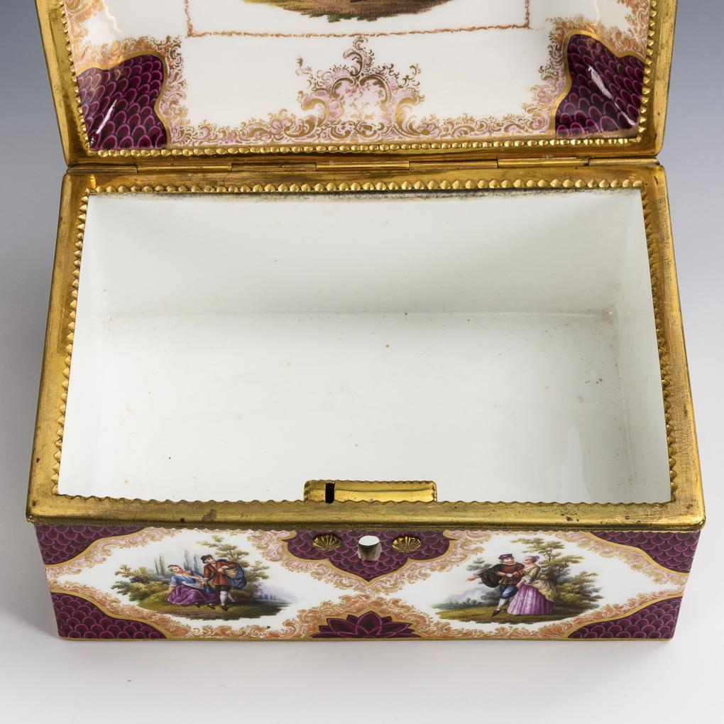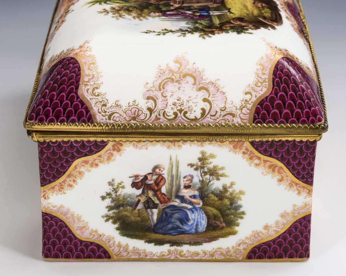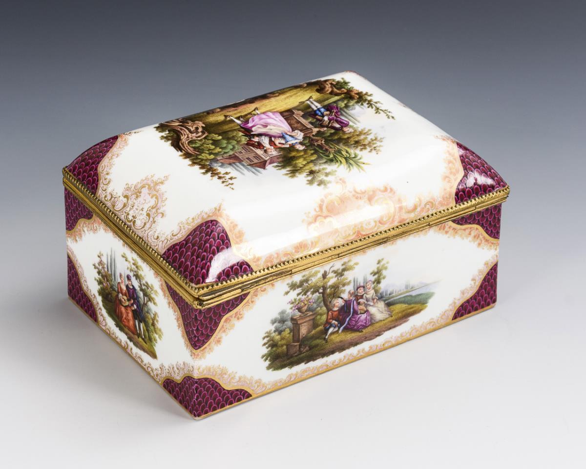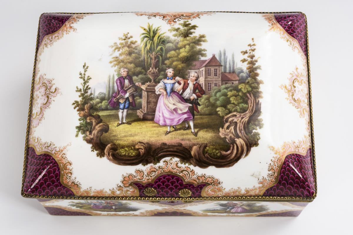 Rectangular casket with brass mounted hinged lid. All sides and lid finely painted gallant scenes, in the corners and spandrels purple scale pattern.