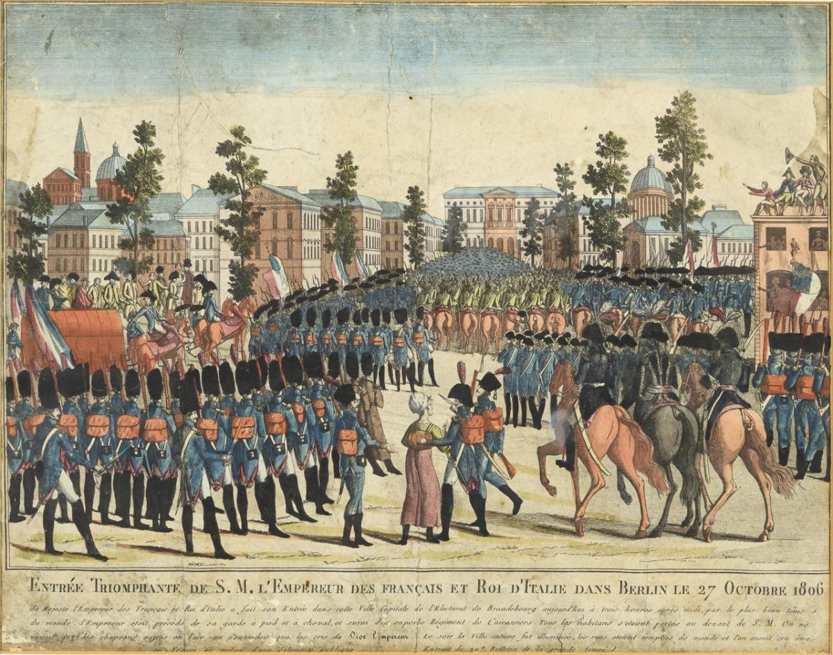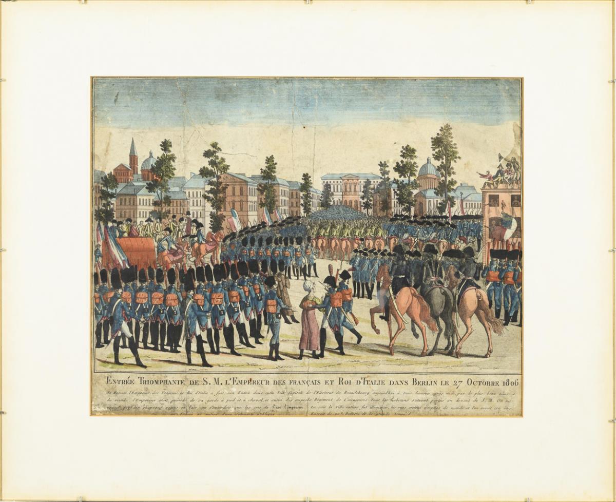 History painting depicting the entry of Napoleon Bonaparte and the Grande Armée in Berlin on October 27, 1806, inscribed "Entrée Triomphante se S.M. L'Empereur des Francais et Roi d'Italie dans Berlin le 27 Octobre 1806". Heavily soiled, foxing, slightly rubbed, centerfold.