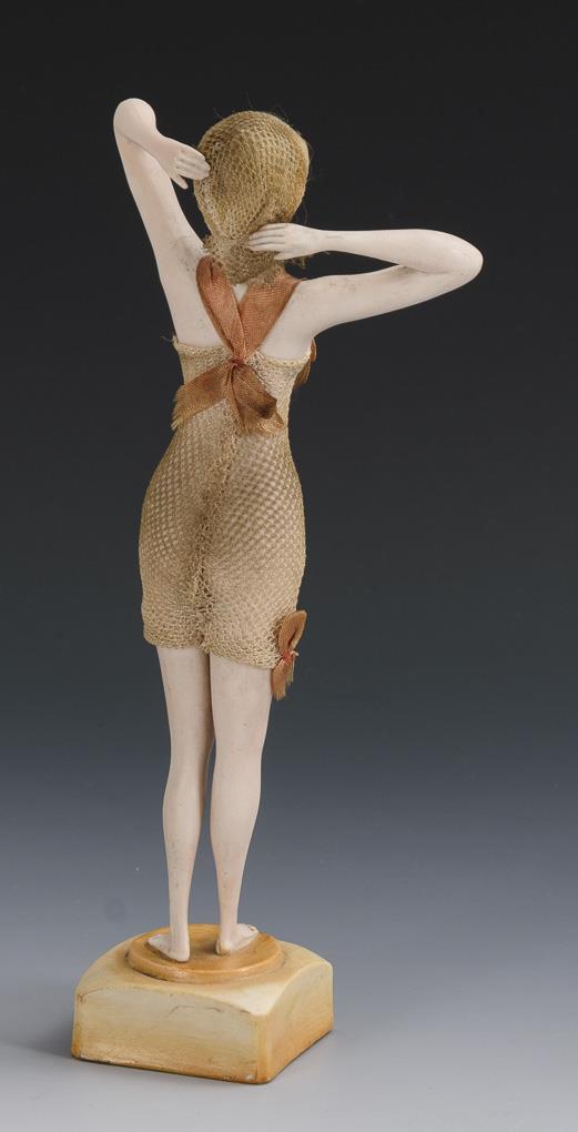 Standing young lady with blond mohair hair, in netted swimsuit.