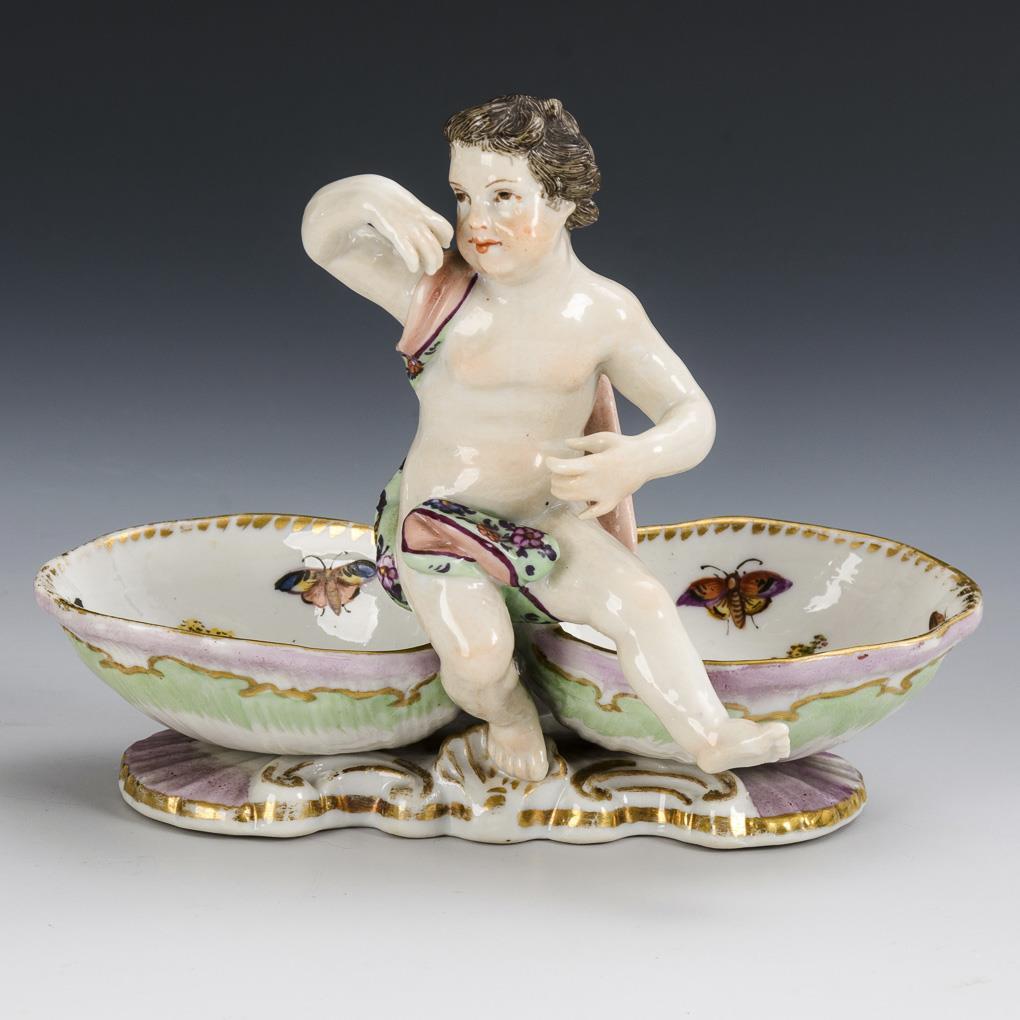 Polychrome painted, gold decorated. H 12,5 cm, L 15,5 cm.