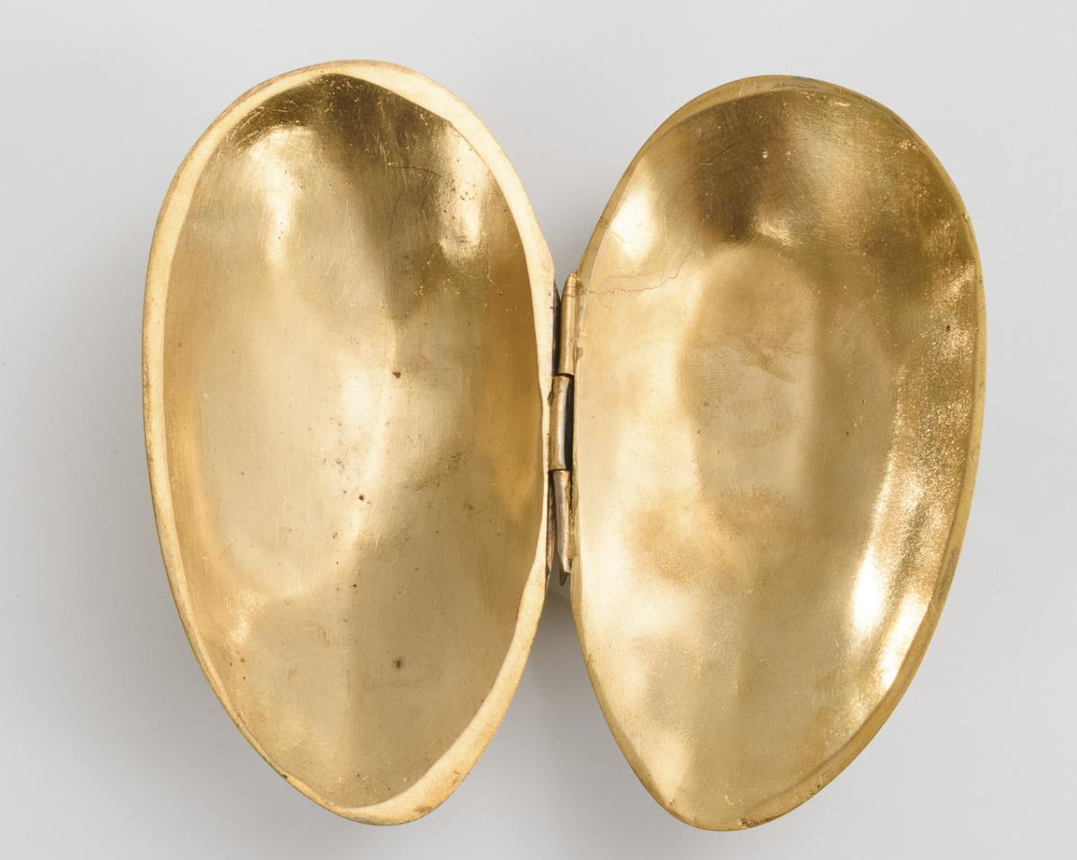 Bronze, gilded inside, on the bottom remains of silver plating. 5,5 x 11,5 x 6 cm.
