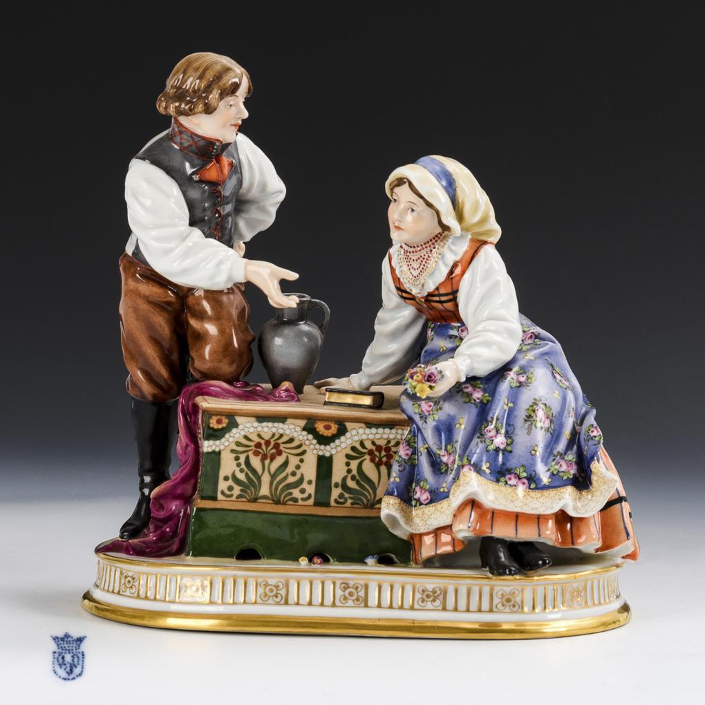 Communicating young couple in Thuringian costume, the woman sitting on a Schnetter chest. Bunch of flowers bumped.