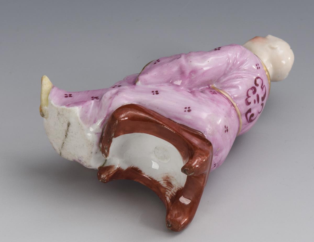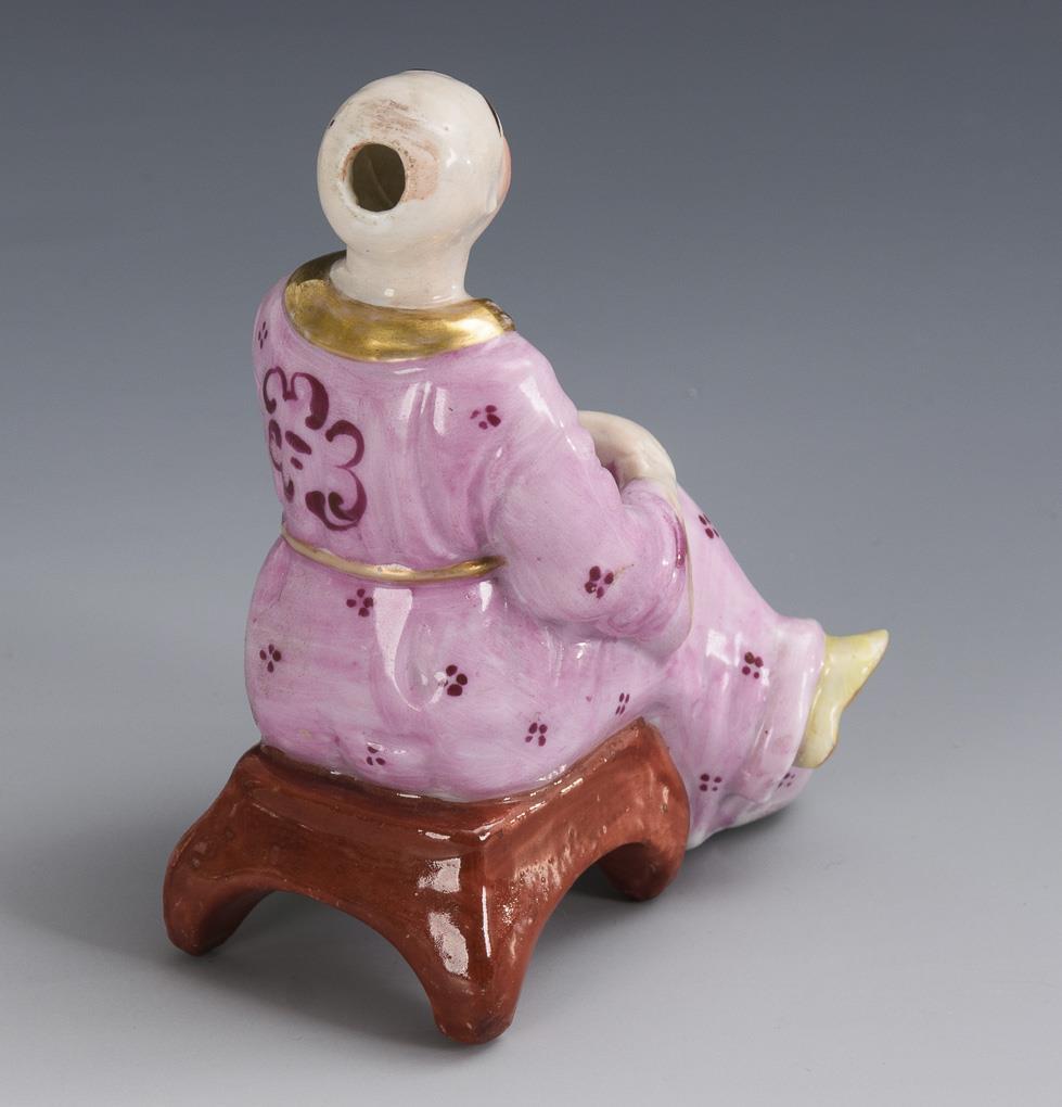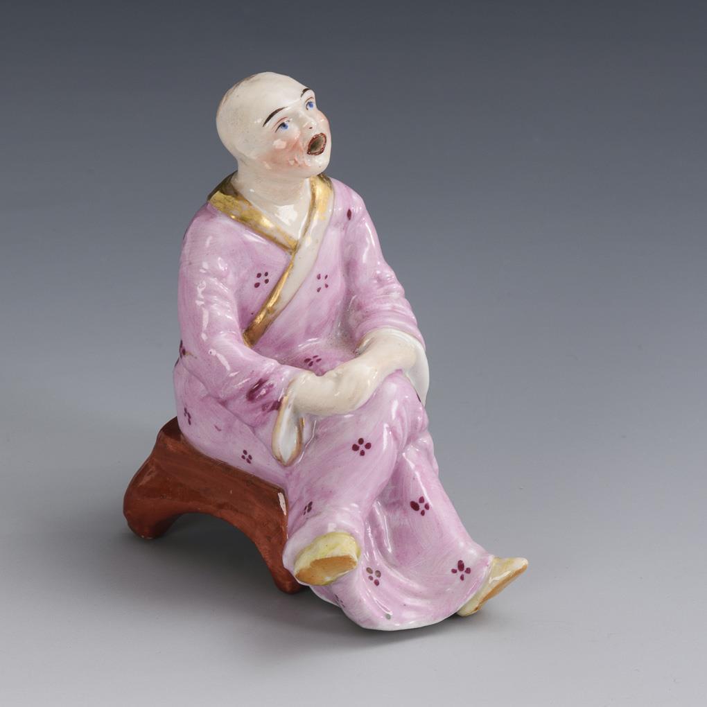 Chinese sitting on a low stool with open mouth and back of the head. Gold partly rubbed.