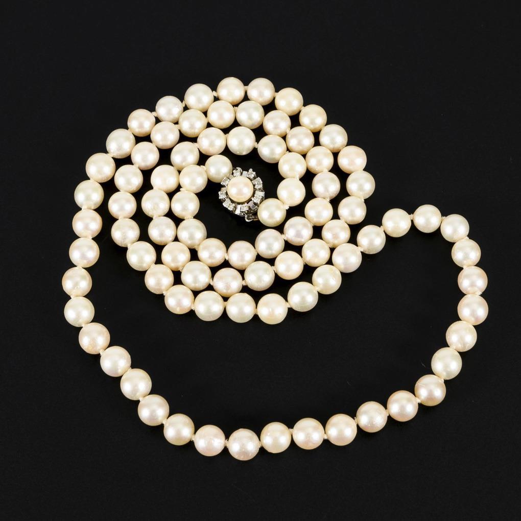 White gold clasp 585 stamped. L 75 cm. Beads Ø 8 mm.