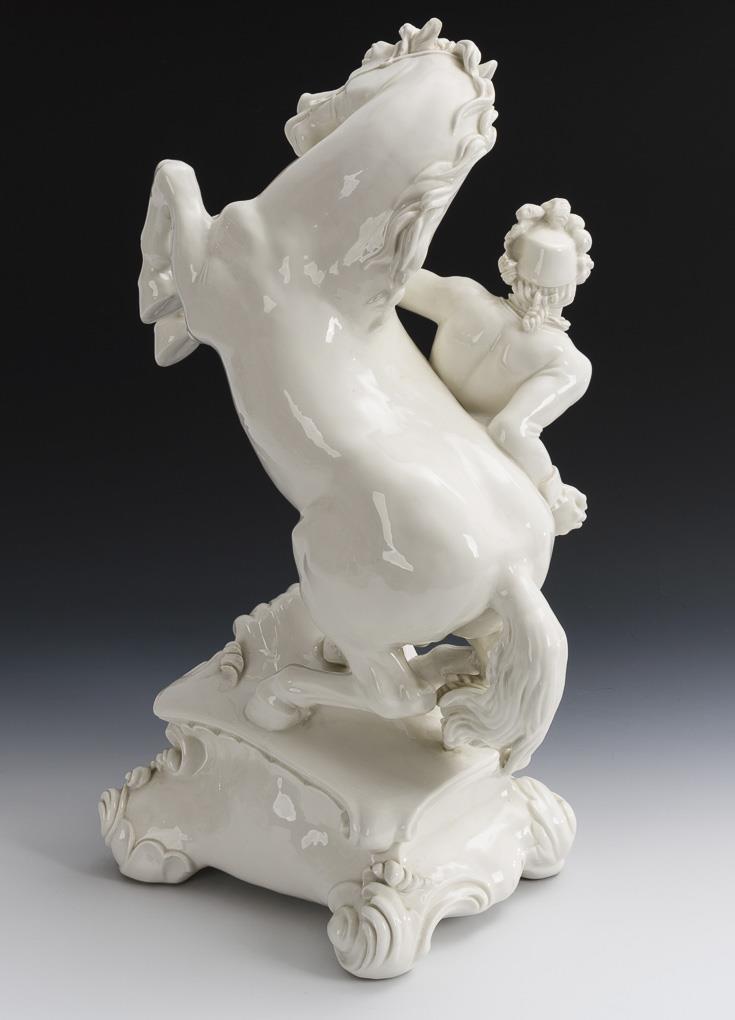 Large sculpture of a young man holding a rising horse. 1 ear bumped, hairline crack in the right leg of the man, above at the base and in the right hind leg of the horse, 2 small hairline cracks at the mouth.