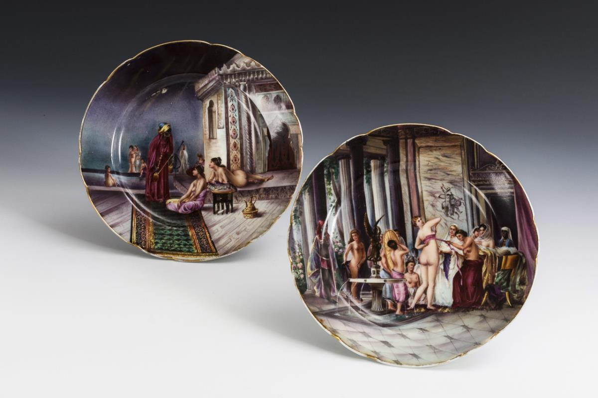 Multi-piece plates each depicting a harem scene. Gold rim rubbed.