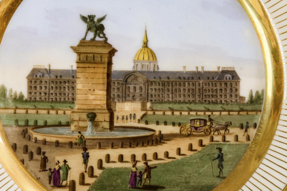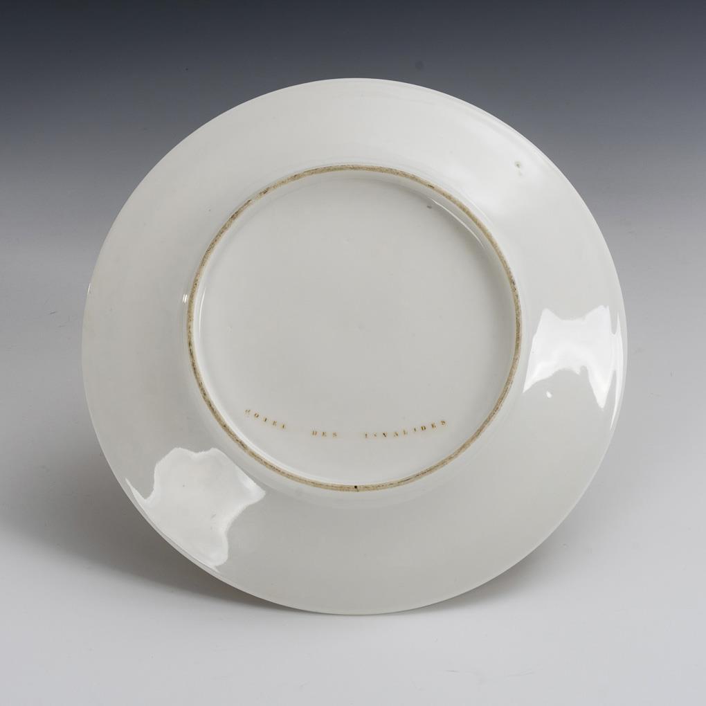 Smooth plate with richly gold-painted flag, in the mirror the bottom marked representation of the Invalides Home in Paris.