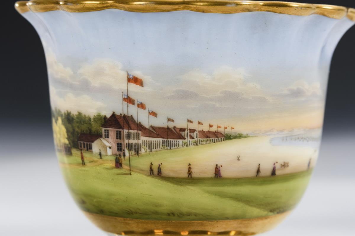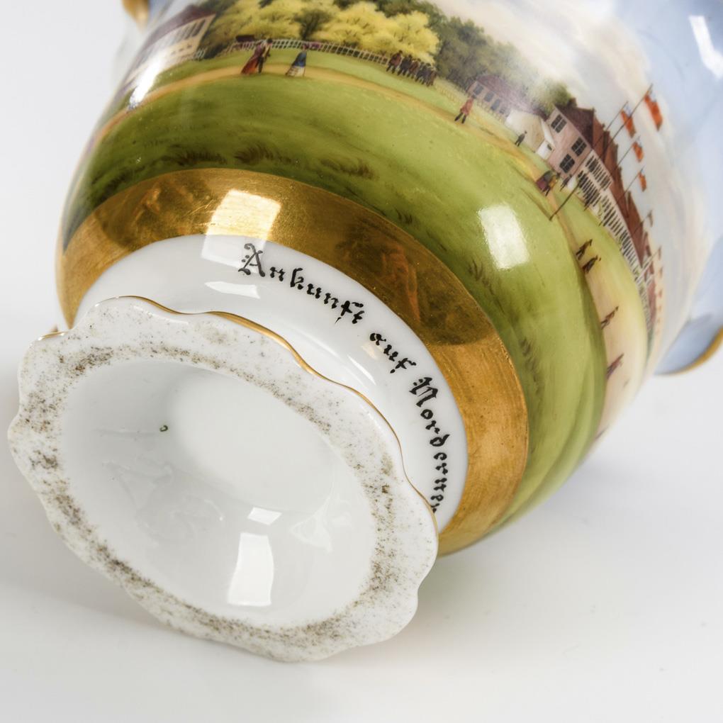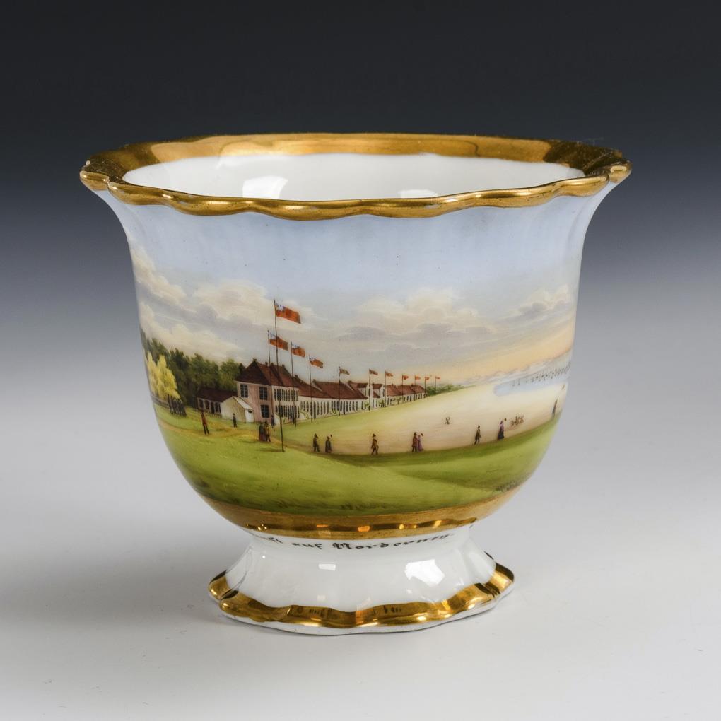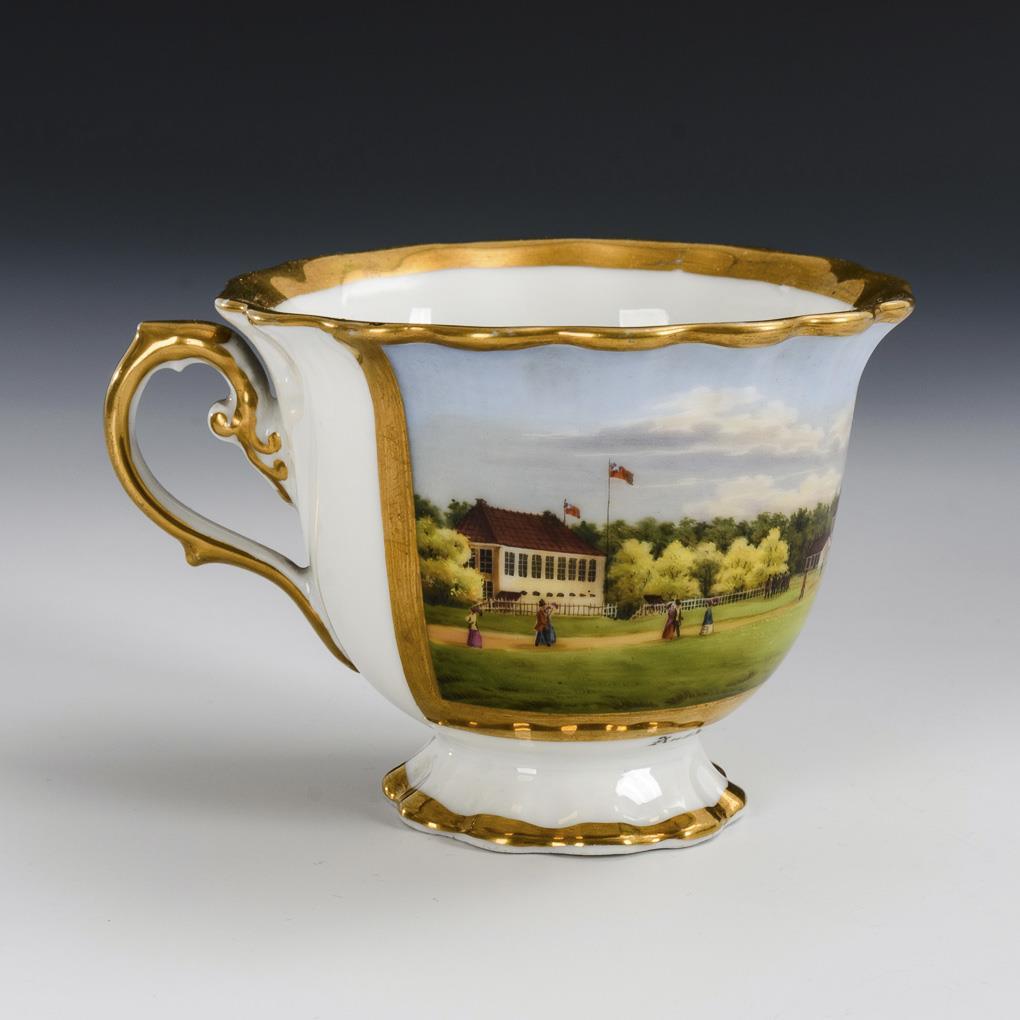 Footed bell cup with ear handle. On the front a gold-framed rectangular cartouche depicting an island scene with coast, guest houses and numerous people.