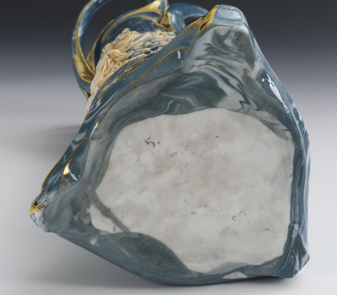 Three-sided conical vase with three curved handles and floral-ornamental relief. On the front the bisque relief of a lady in a rose garden. Partially gold somewhat rubbed.