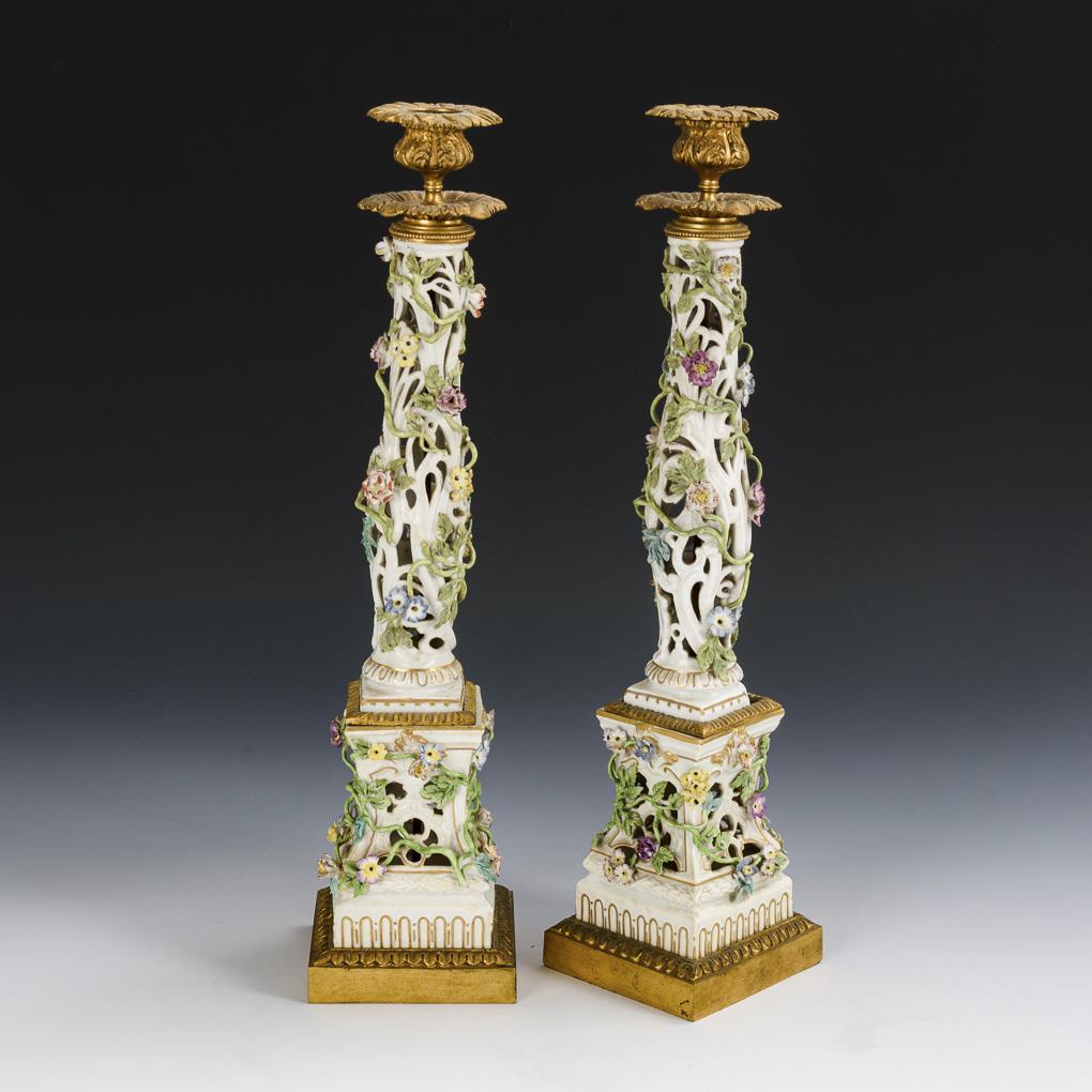 Decorative, floral-lined candelabra with openwork base and stem, bronze mount on stand and bronze spout. Few bumps on the covering, 1 foot corner bumped.
