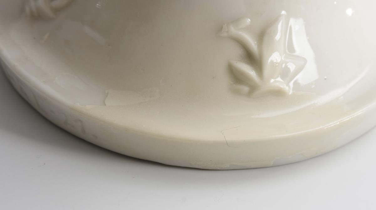 Female nude growing out of a plant. Restored at the base, 3 leaves and legs restored.