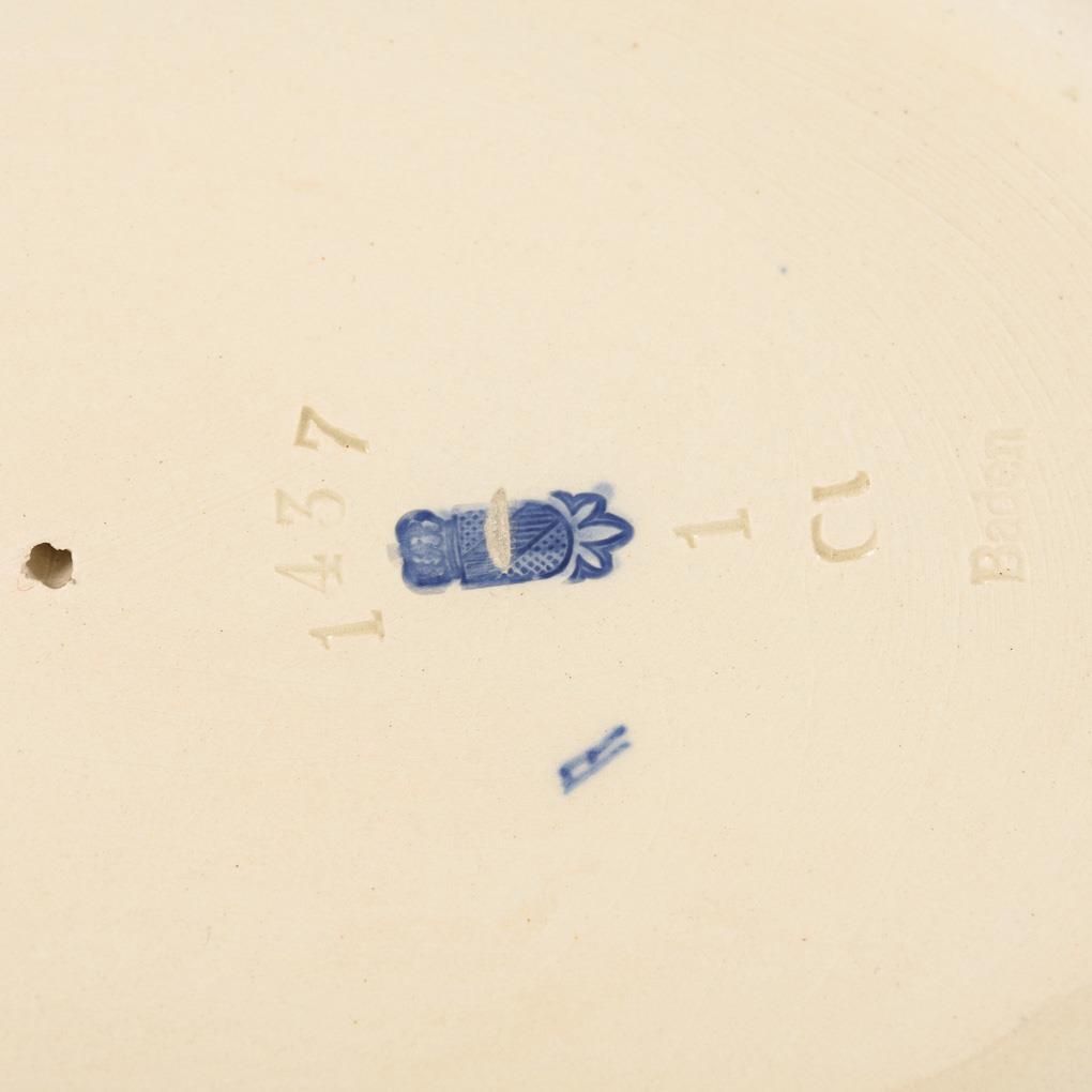 Stoneware, white glazed and colorfully decorated. H 17,5 cm, L 32 cm.