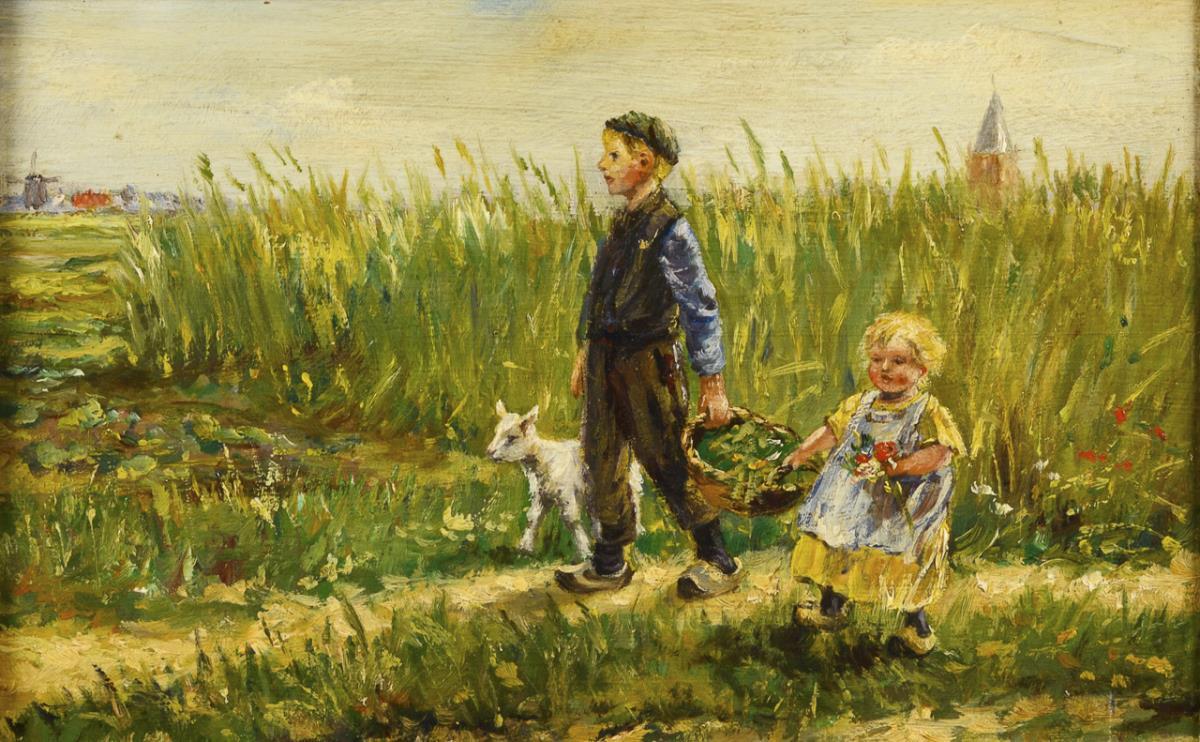The two children with basket and the small goat at the edge of the field not far from the village.