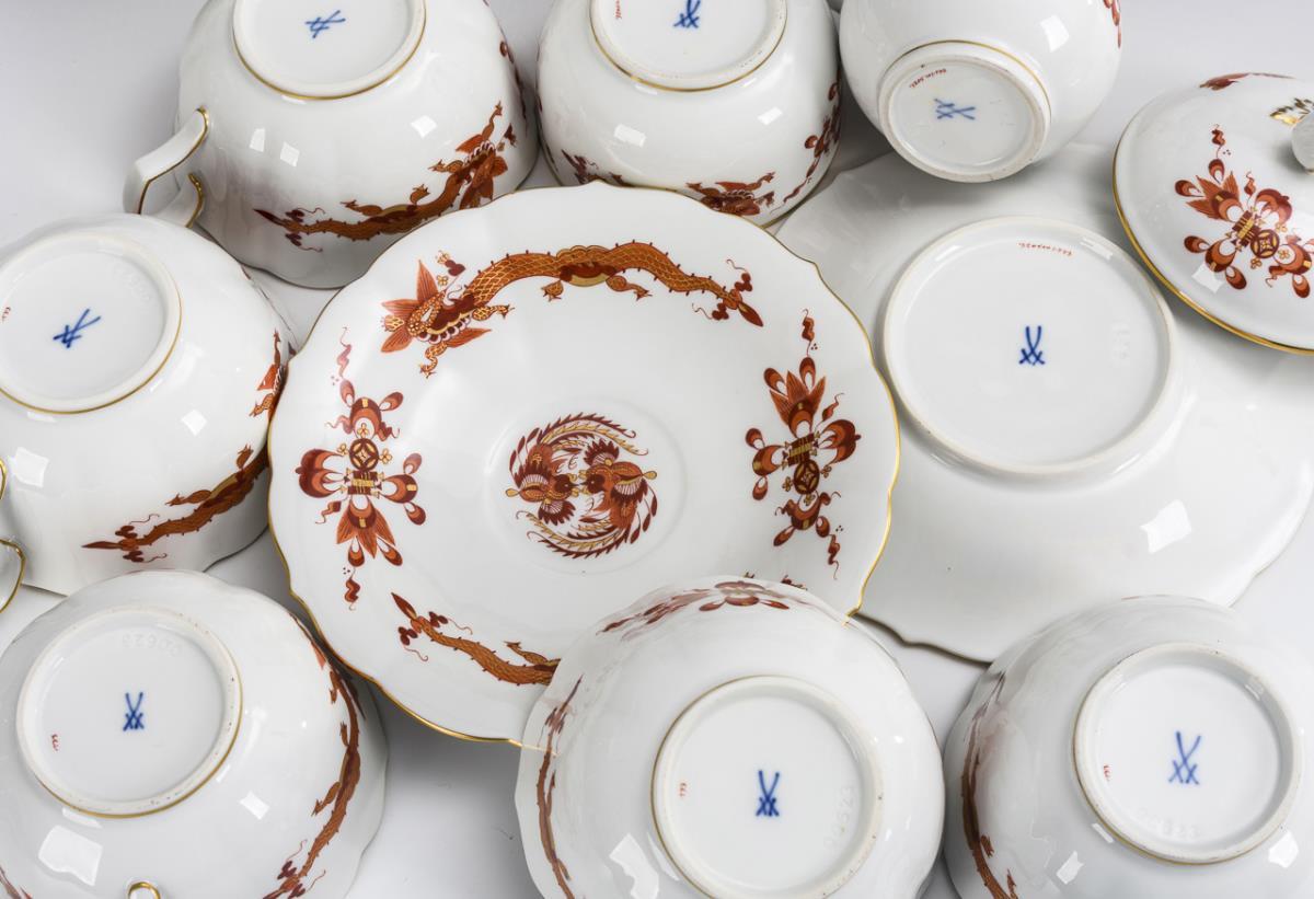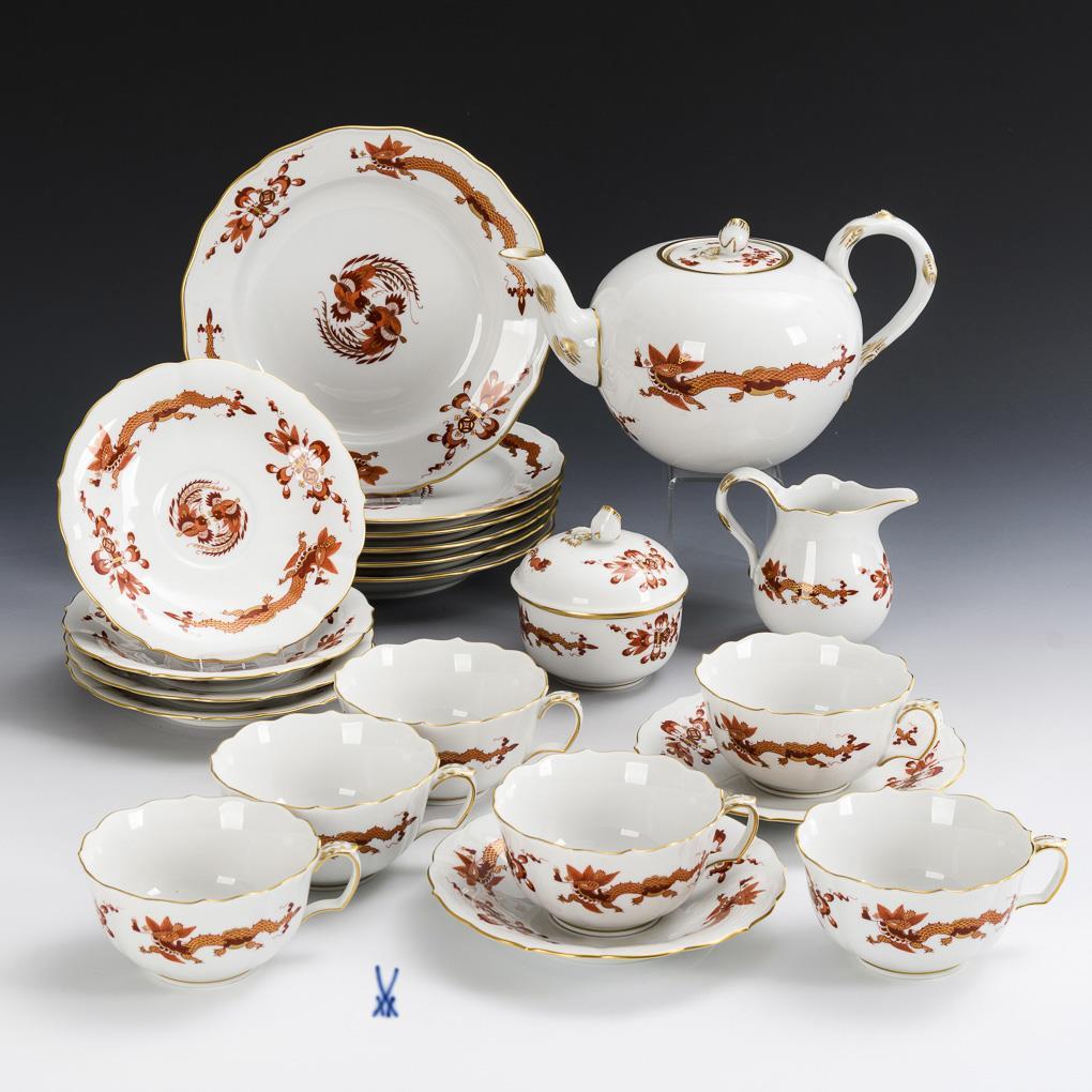 21 pieces. Form "New Cutout". Teapot (h 12.5 cm), creamer, sugar bowl, 6 tea cups, 6 saucers and 6 breakfast plates.