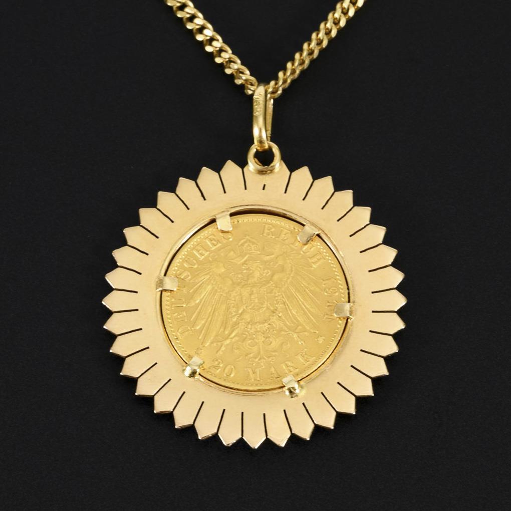Frame-set German gold coin 20 Deutsche Mark, 1911 A, Wilhelm II, in radiating ornamental frame, on curb chain with ring spring clasp.
