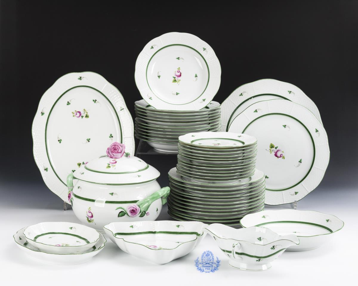 45 parts. Form "Altozier". Green rim and rose painting. 12 dinner plates, 12 soup plates, 12 salad plates, 1 tureen (H 21 cm), 1 sauce boat, 2 oval bowls (L 22 and 26.5 cm), 1 round bowl (Ø 25.5 cm), 1 oval plate (L 37.5 cm), 2 vegetable plates (Ø 30 and 33 cm), 1 triangular bowl (Ø 24.5 cm). Partially small paint chips.