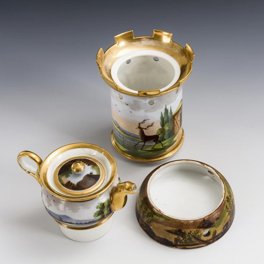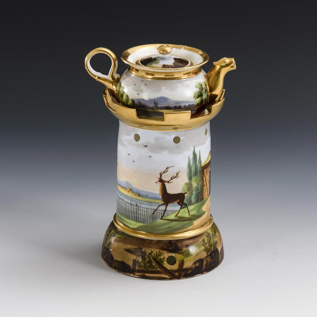 Designed in the form of a tower, two-part teapot with teapot, surrounding the depiction of a seascape. Glued breakout on the rim of the teapot, minimal gold abrasion.