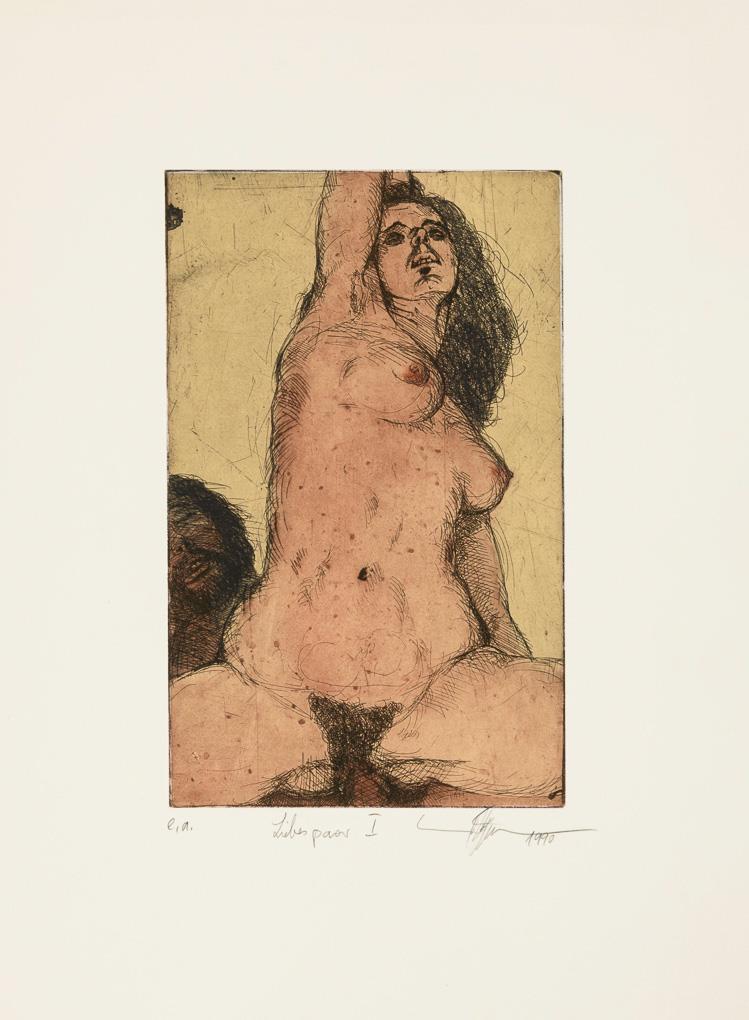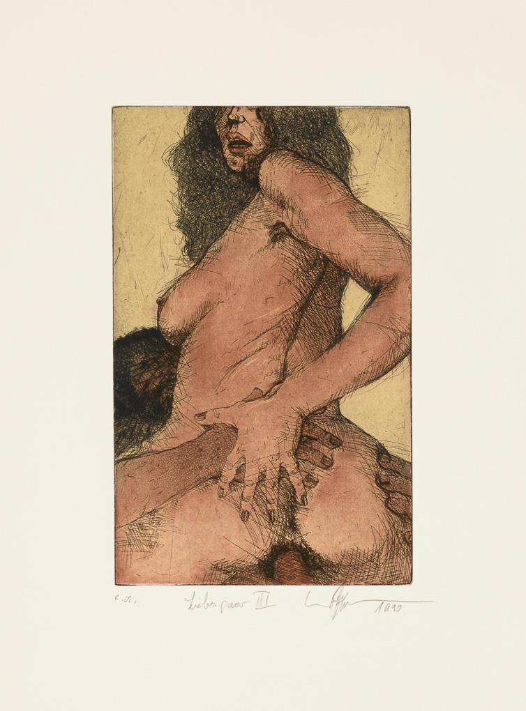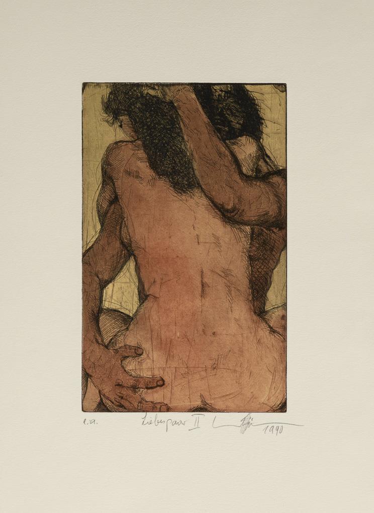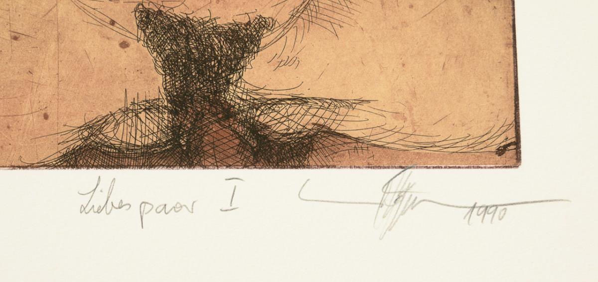 In addition, supplement with 3 poems by Heinz Kahlau and brown folding folder with signed label of the artist, titled "Liebespaare Büchergilde Gutenberg 1991".