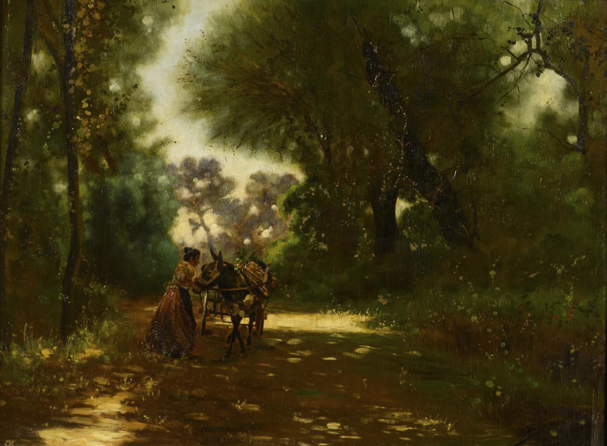 Young woman with the animal and the cart on a road in the shade of trees. Paint chips.