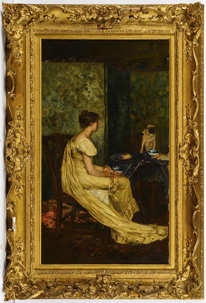 Young woman in yellow dress at a table with coffee cup and pug. Canvas doubled.