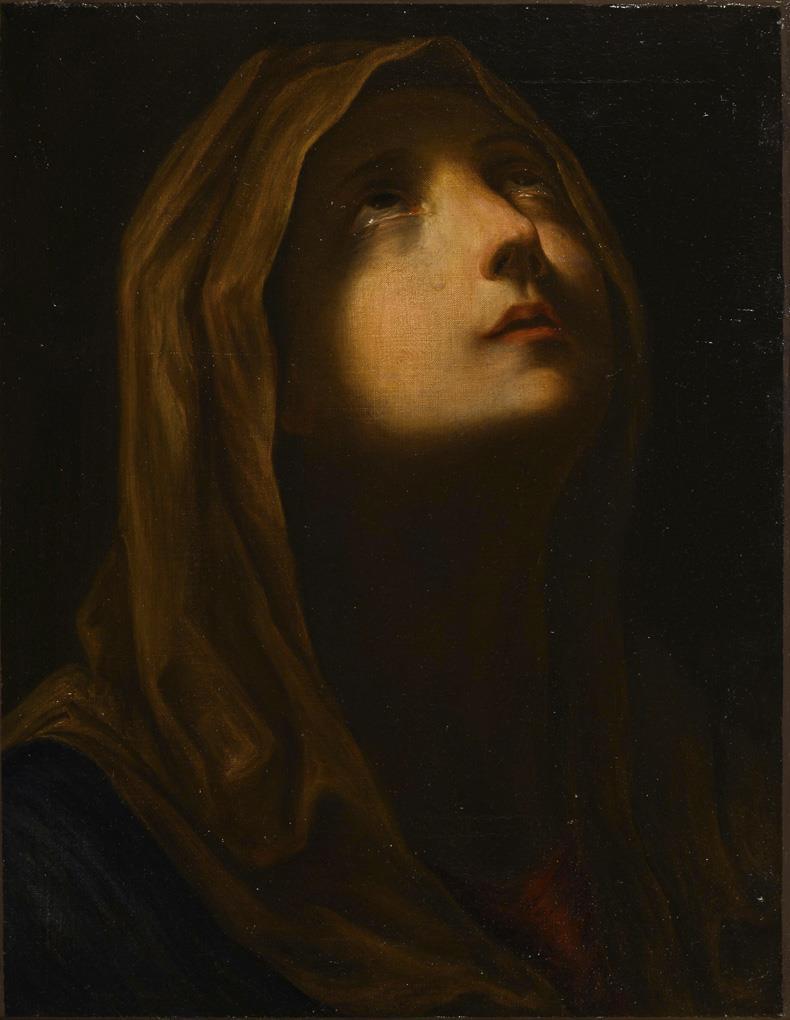 With tears in the eyes upward looking young woman in red-blue robe with veil. Two small restored spot.