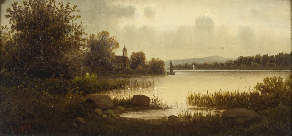 Stony riverbank with church and sailboat under cloudy sky. Minimal signs of age.