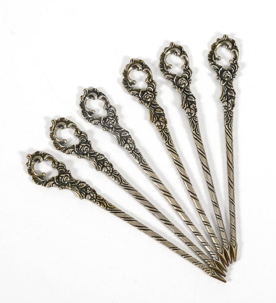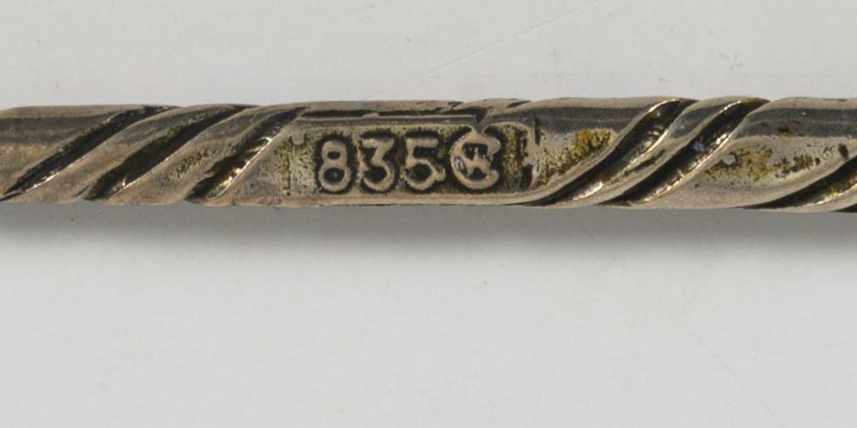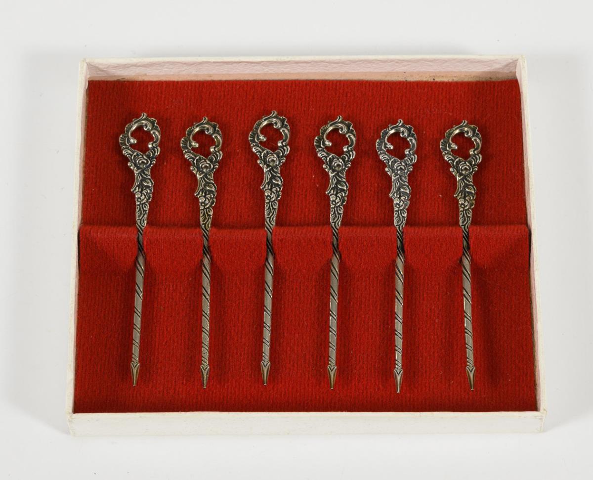 8 pieces: 2 cake servers, 1 pie server, 3 spoons and 2 forks. Plus box "Widmann Antique Silver" with 6 skewers.