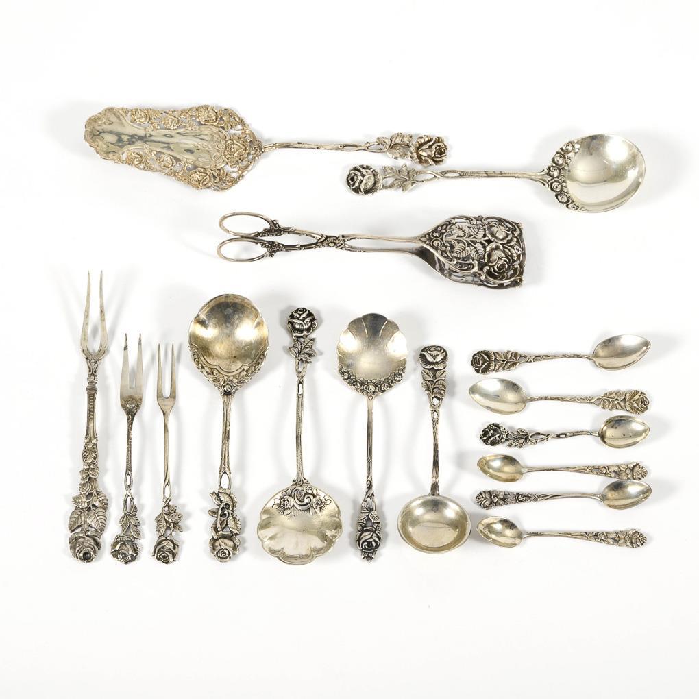 16 pieces with relief decoration Hildesheim Rose: cake server, pastry tongs, 5 cream spoons, 3 serving forks and 6 mocha spoons.