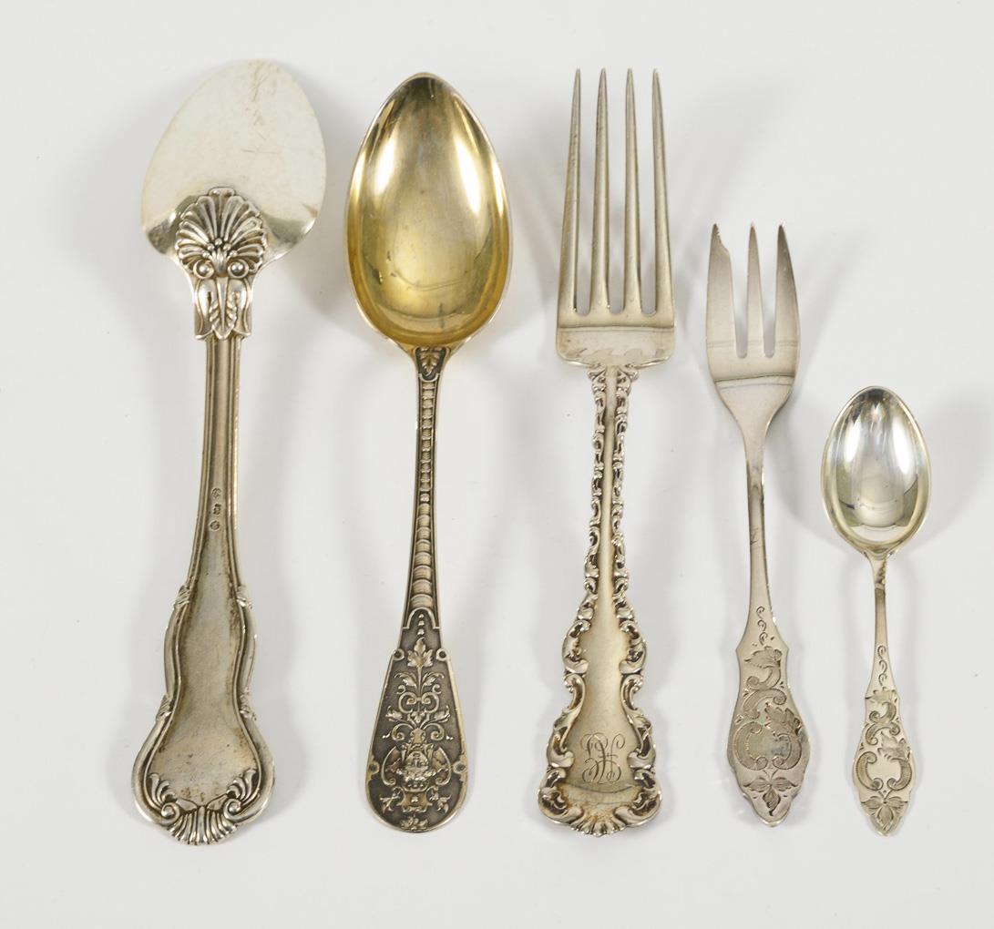 19 richly relieved and engraved pieces: 6 heavy dinner forks (sterling, USA). / 6 cake forks and 5 matching mocha spoons. / 2 single soup spoons.