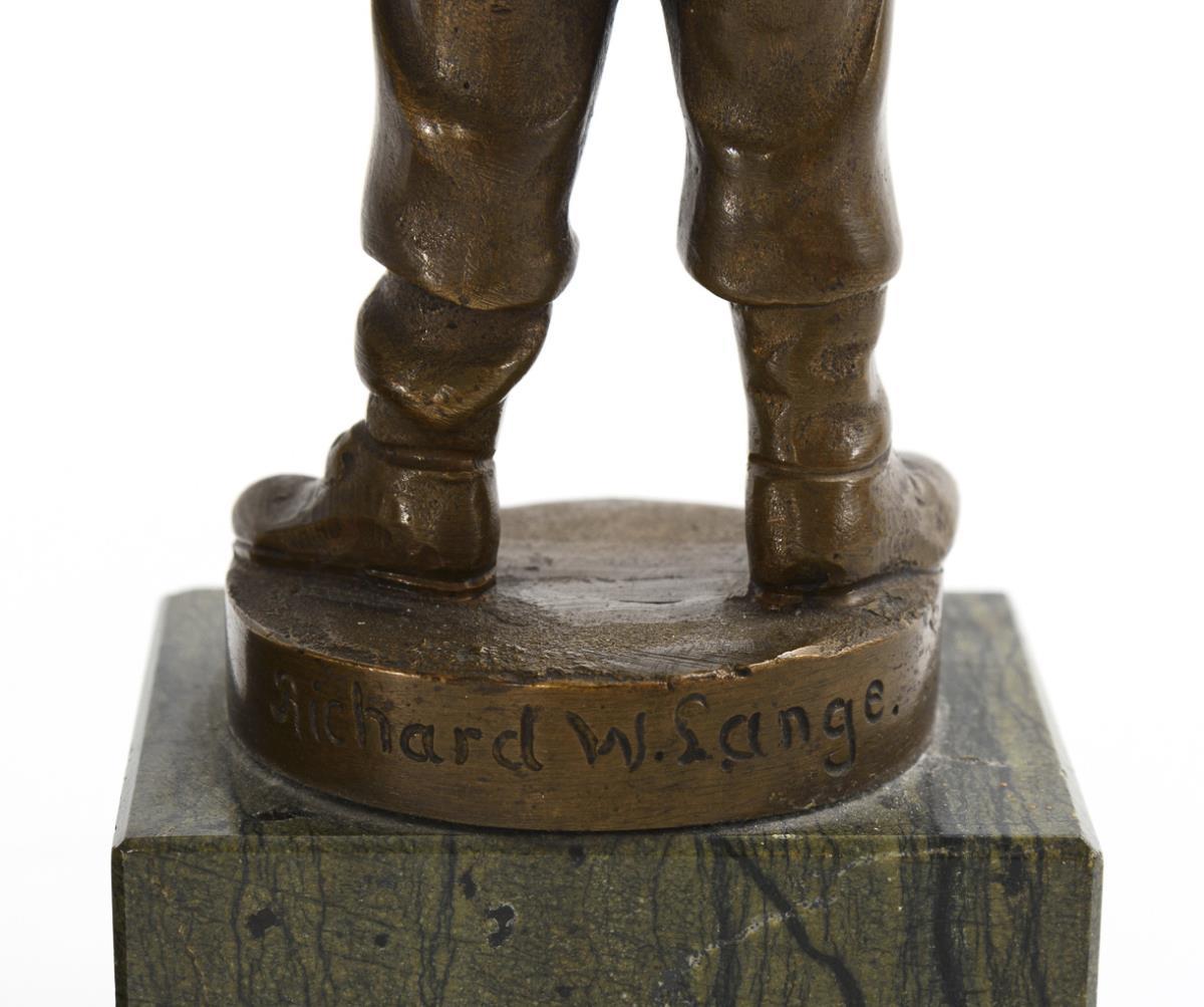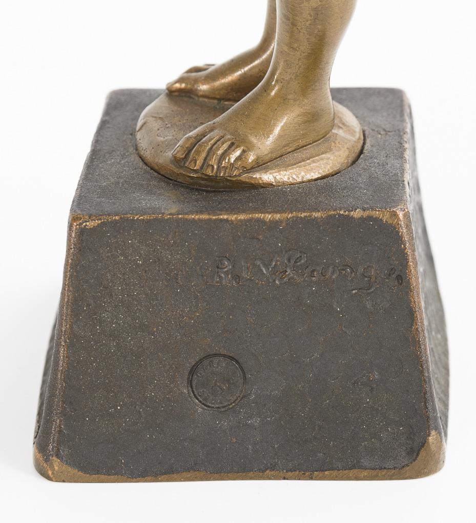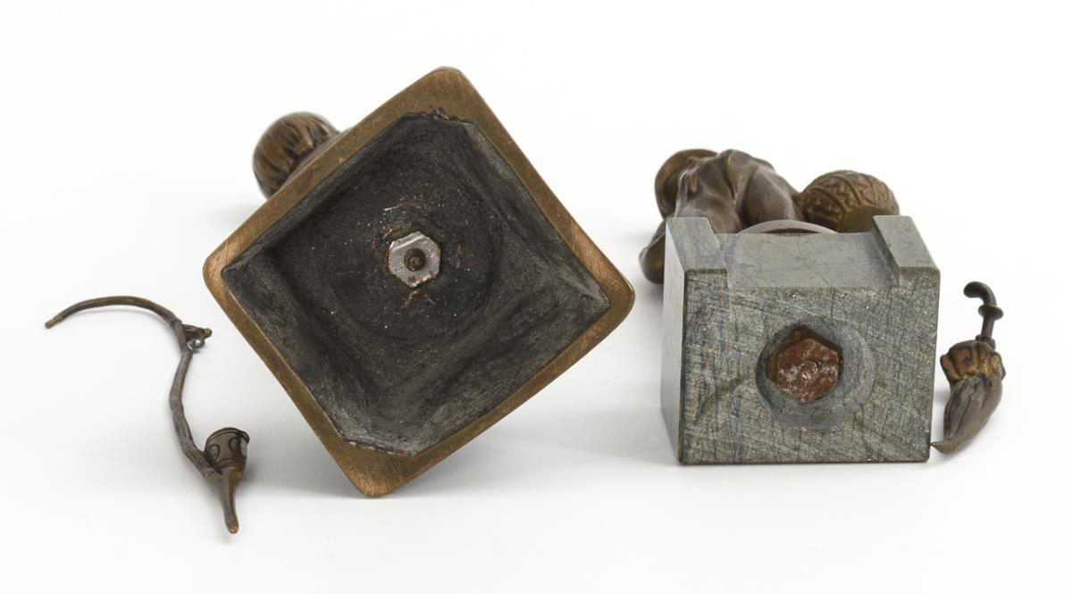 Bronze patinated, base of bronze and green marble respectively. Each inscribed, smoker with foundry mark "Garanti Bronce". H 18 and 12 / 15,5 cm respectively.