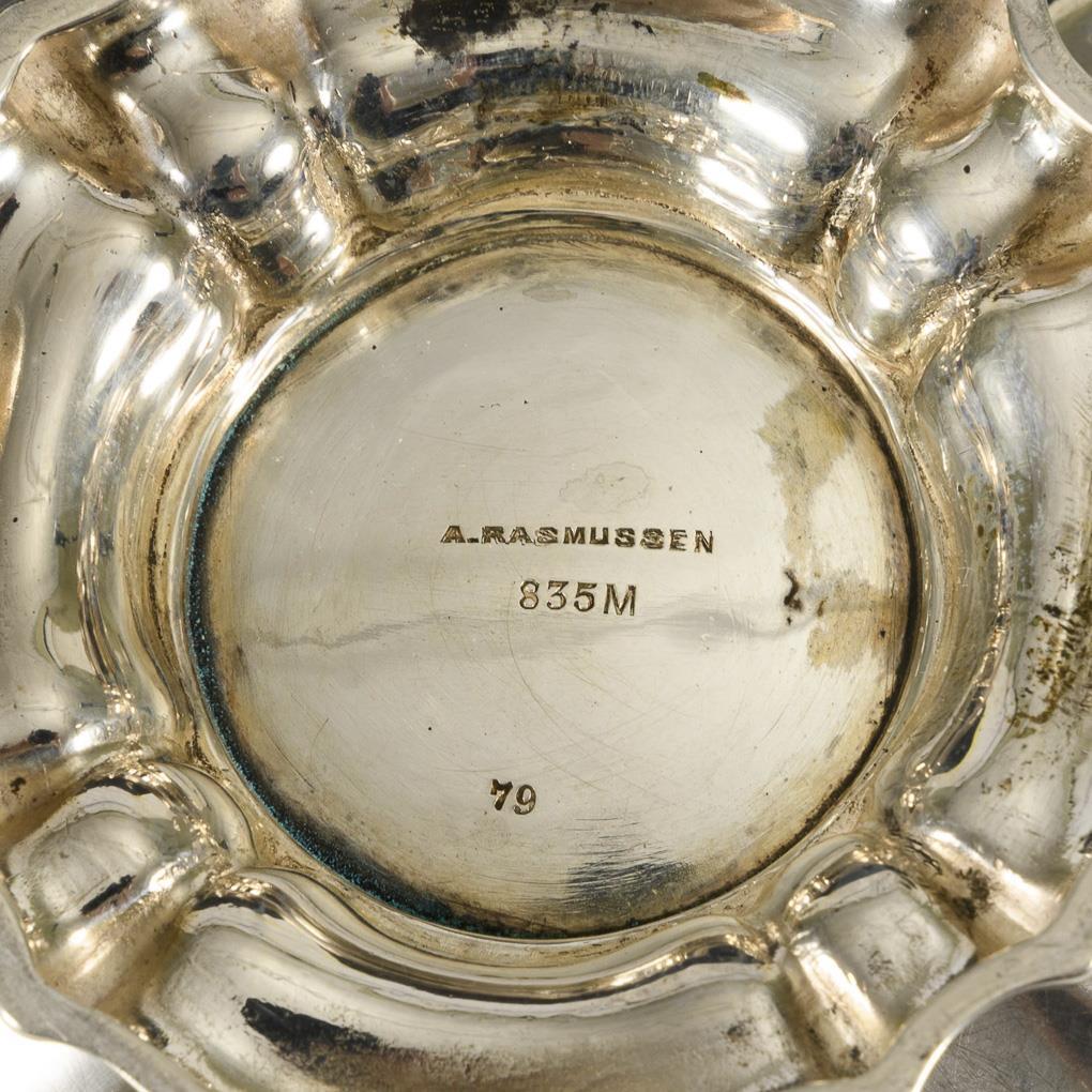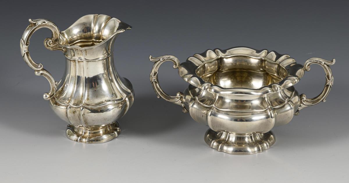 Godroned and bulged form with curved handles. Jug with some small dents.