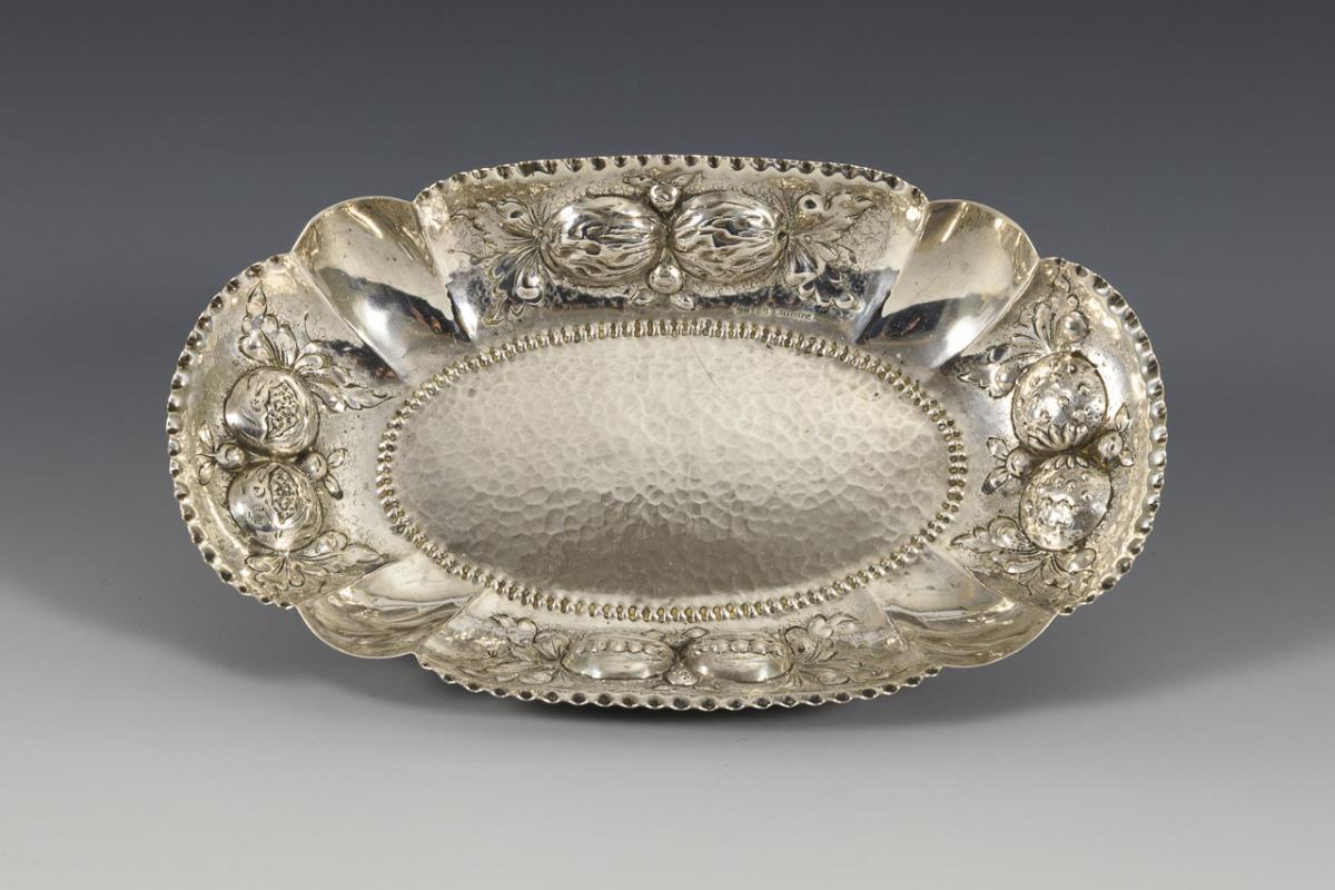 Oval silver bowl with fruit rim.
