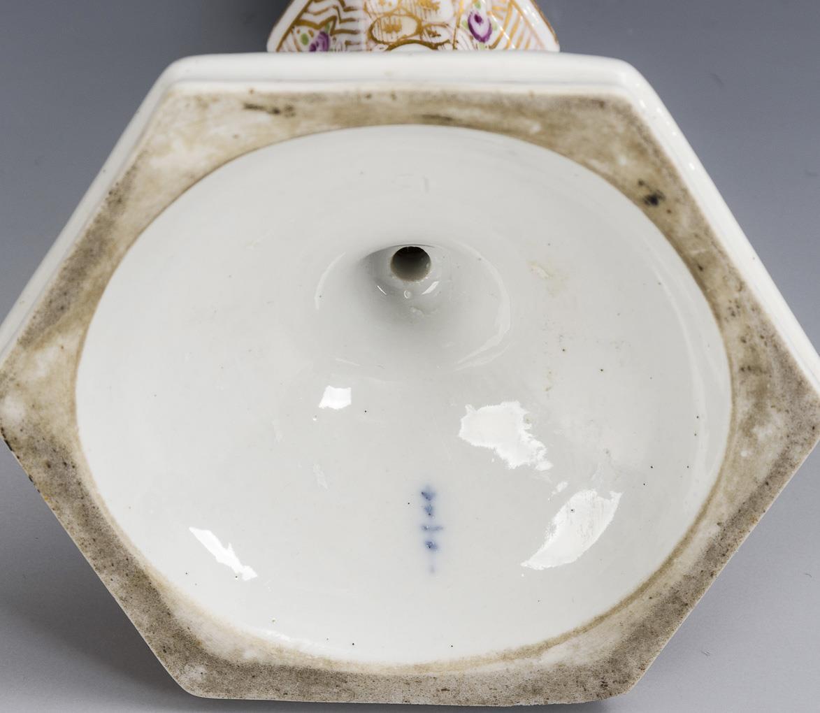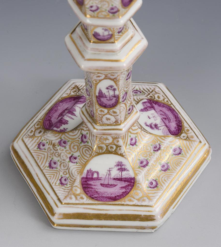 Hexagonal candelabrum with multiple jointed shaft. In small oval cartouches purple landscape painting. Gold somewhat rubbed.