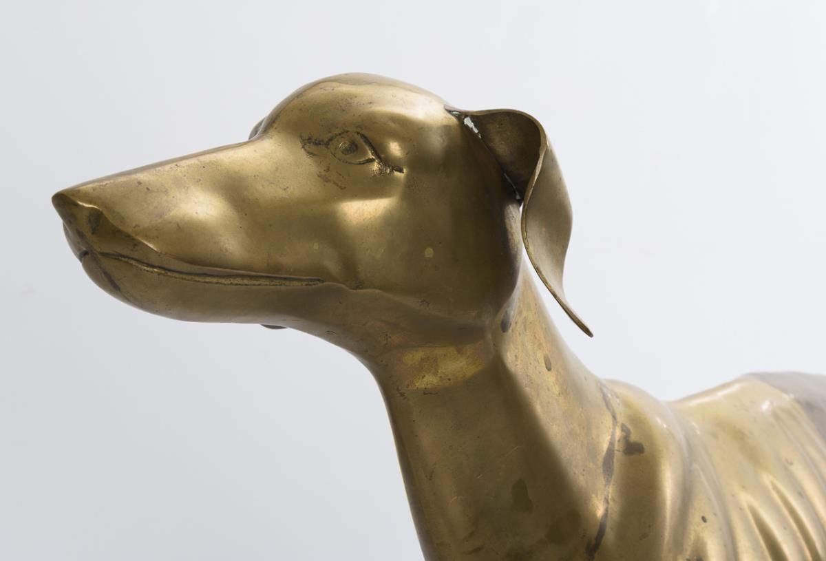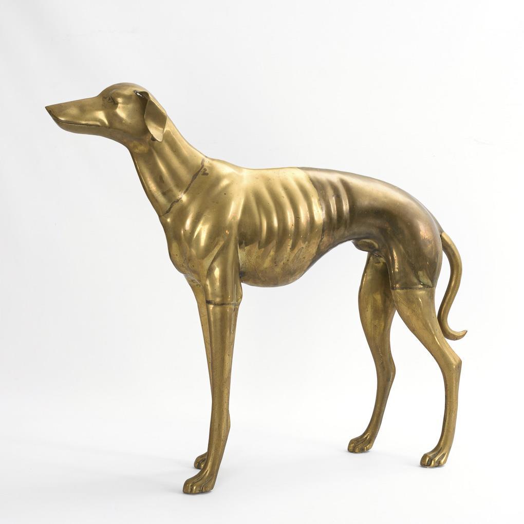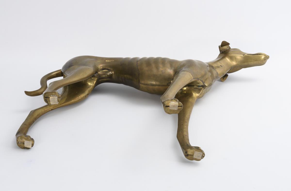 Attentively probably looking up to the owner slender dog. Spotted patina, visible traces of soldering, but no hairline cracks, 1 inconspicuous dent.