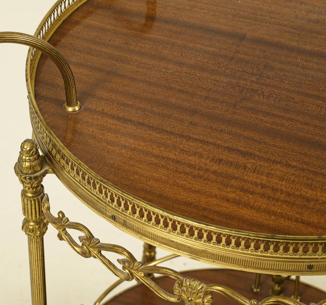 Wheeled tea trolley (so-called Desserte) made of fluted brass frame with 2 wooden shelves, lower shelf with brass frame. Metal with traces of corrosion, signs of age / use.